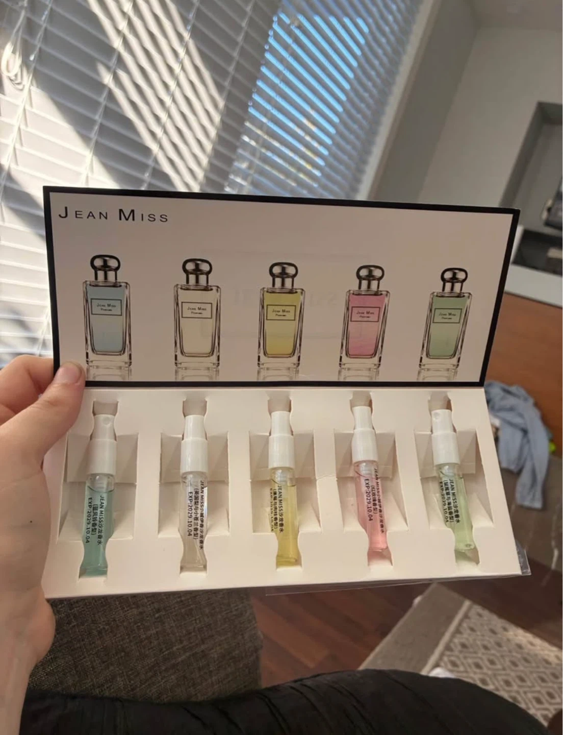 47Selling a Jean Miss perfume sample set! This set includes a variety of different scents to try out. Each sample is in a small vial, perfect for testing or travel. The box includes a presentation of the full sized bottles as well