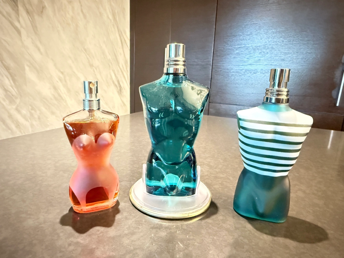 475Selling a set of Jean Paul Gaultier perfume bottles. Includes Classique (pink), Le Male (blue), and Le Male (striped). They are in great condition and would make a nice addition to any collection!