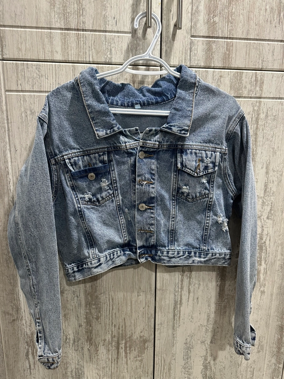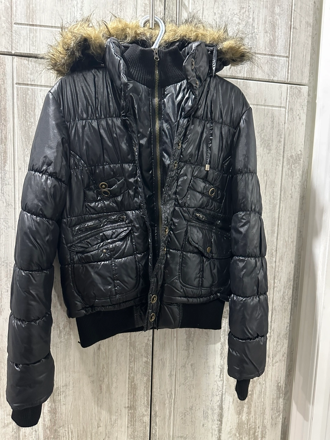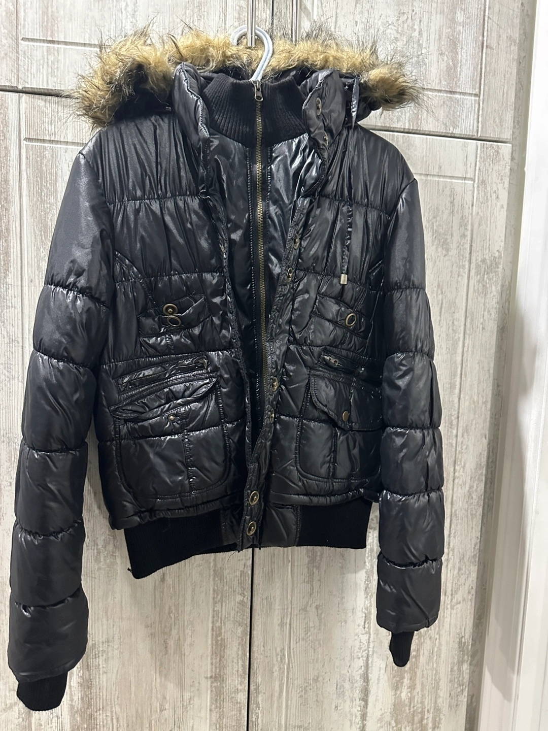 Selling a stylish black puffer jacket! It features a cozy fur hood and a flattering fit. Perfect for staying warm and fashionable during the colder months and beautiful jeans jacket in excellent condition all for 15 dollars