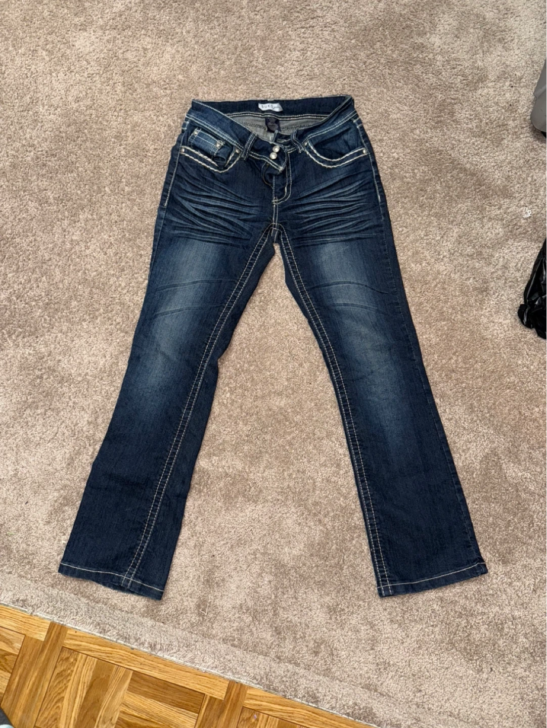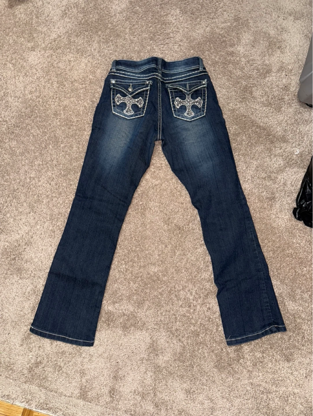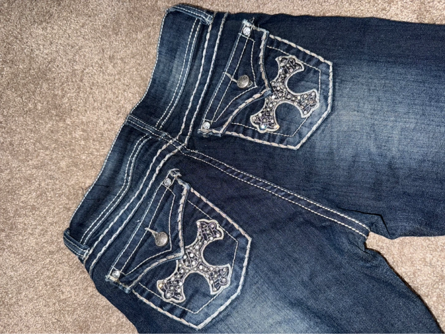 10Dark wash jeans with a cross design on the back pockets. They're in great condition and ready for a new home