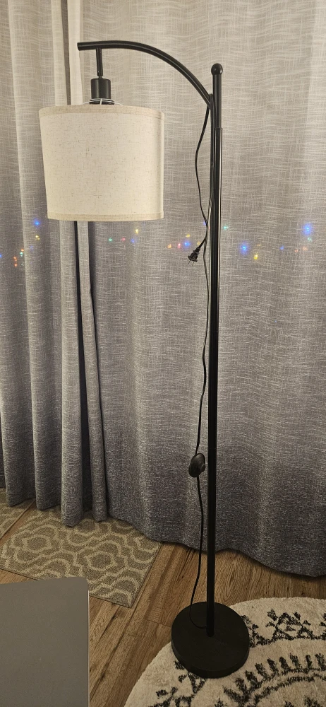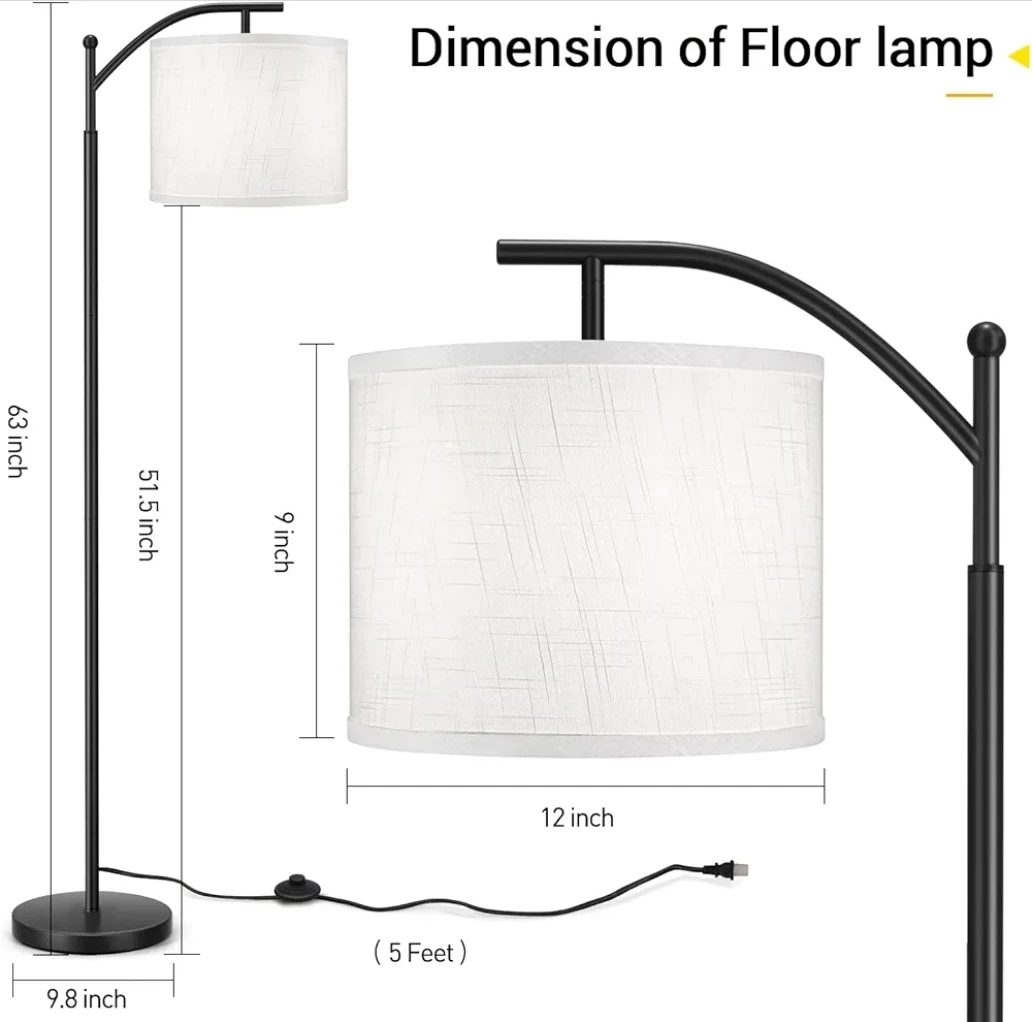 Here's a stylish black arc floor lamp in perfect condition. It stands 63 inches tall, with a lampshade that's 9 inches high and 12 inches wide. The base has a diameter of 9.8 inches. It's a great addition to any living room or bedroom.