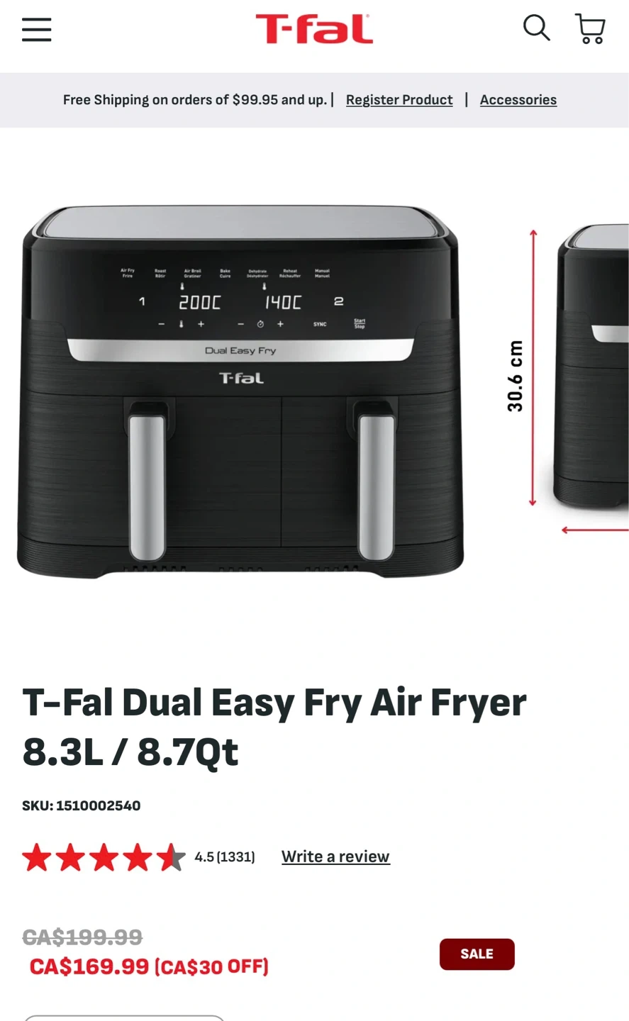 T-Fal Dual Easy Fry Air Fryer 8.3L / 8.7Qt