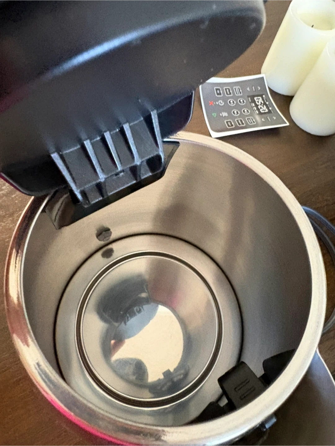 Stainless steel electric kettle with a black handle. It's designed for boiling water quickly. Useful for making tea or coffee.