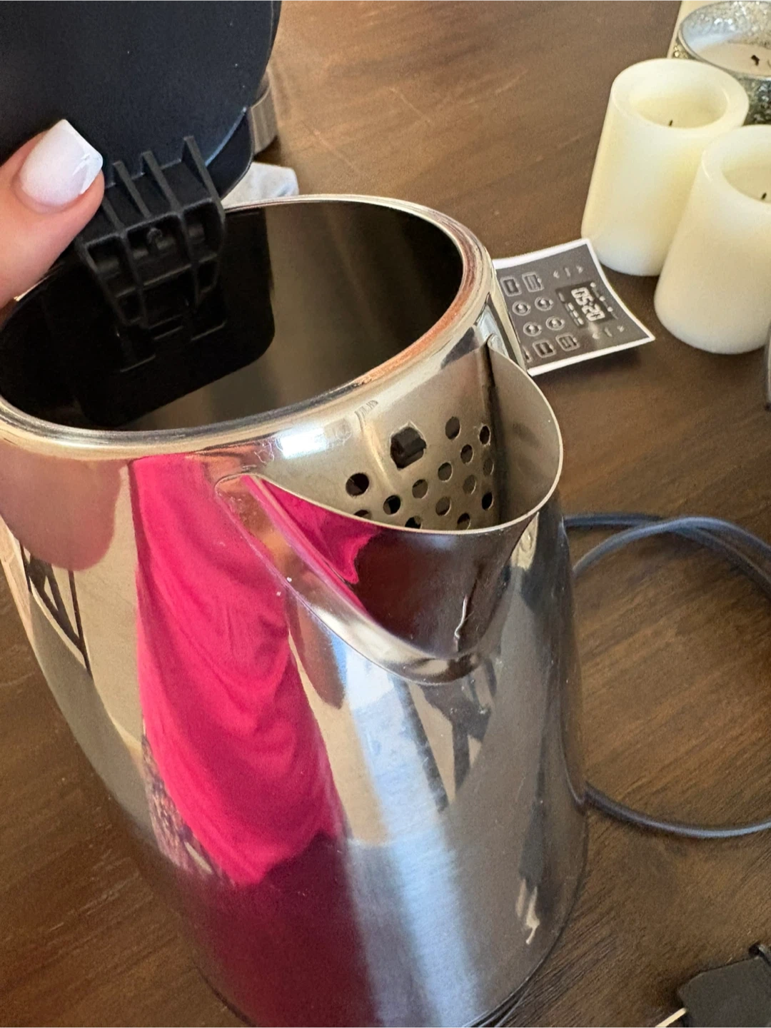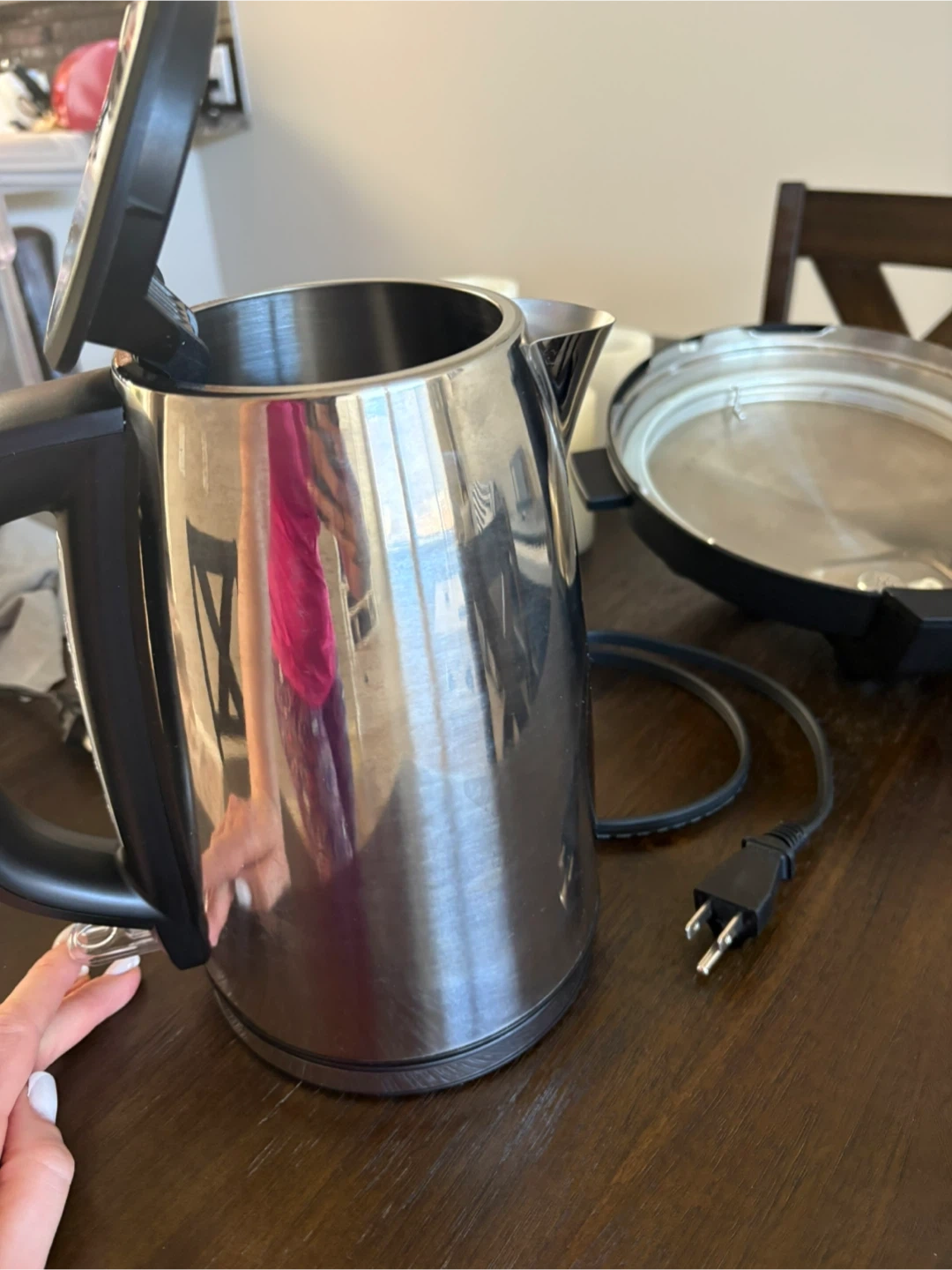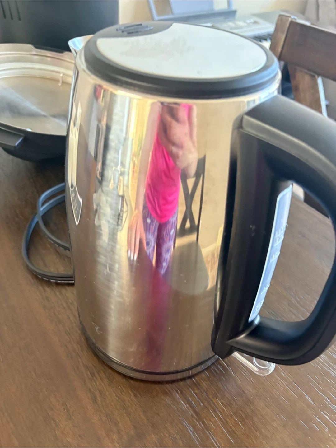 Stainless steel electric kettle with a black handle. It's designed for boiling water quickly. Useful for making tea or coffee.