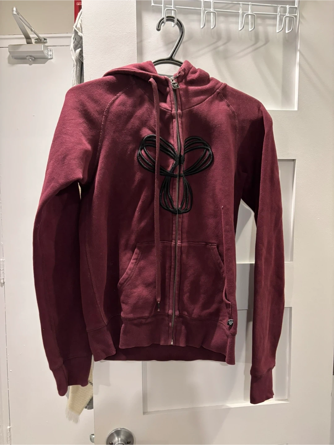 Cozy TNA zip-up hoodie in a rich burgundy colour. Features the classic TNA logo on the chest and a kangaroo pocket. Made for comfort and casual style!