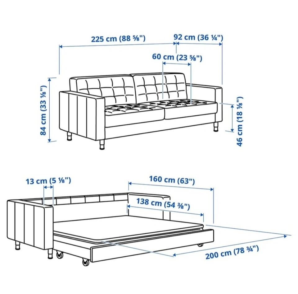 This sofa comfortably doubles as a Queen-size bed, perfect for guests. It was purchased new only 8 months ago and is in excellent condition. It features hidden storage under the seat, durable Gunnared polyester fabric with a wool-like feel, and natural wood legs. The sofa offers firm sitting comfort and the bed has wooden slats for support. It's ideal for guest rooms, apartments, or multipurpose spaces. The matching MORABO Footstool is also available separately. Dimensions: Width 225 cm (88 5/8"), Depth 92 cm (36 1/4"), Height 84 cm (33 1/8"). Bed size: 200 cm L x 138 cm W. Feel free to message if you have any questions!