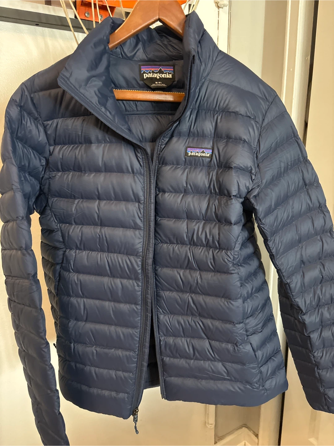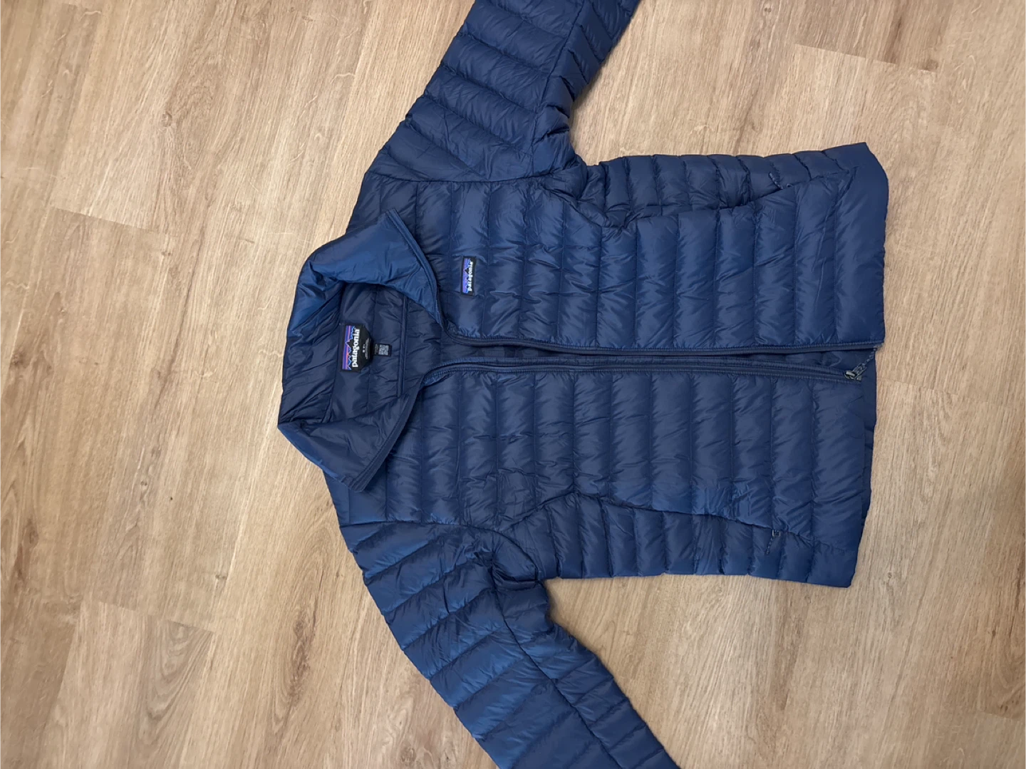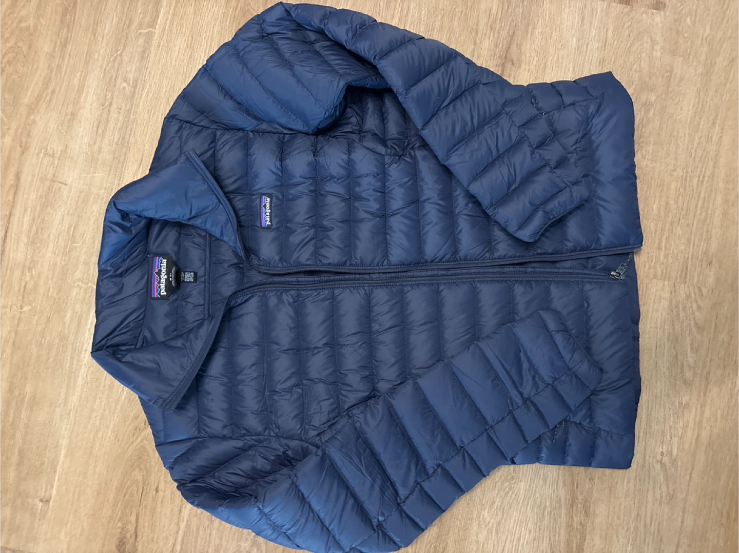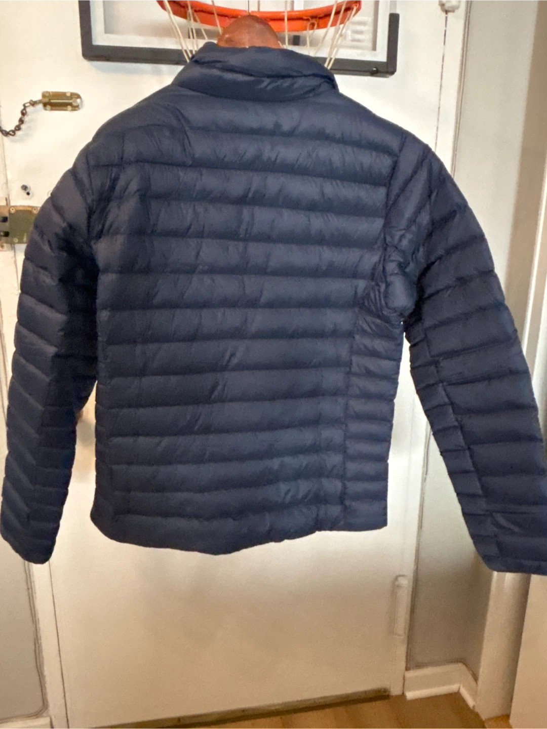 Patagonia navy blue sweater jacket. Lightweight and warm, it's perfect for layering. Features a full zip front and two hand pockets. This jacket is designed for outdoor activities. Bought an extra one, but it was non-returnable and now I don’t need it.