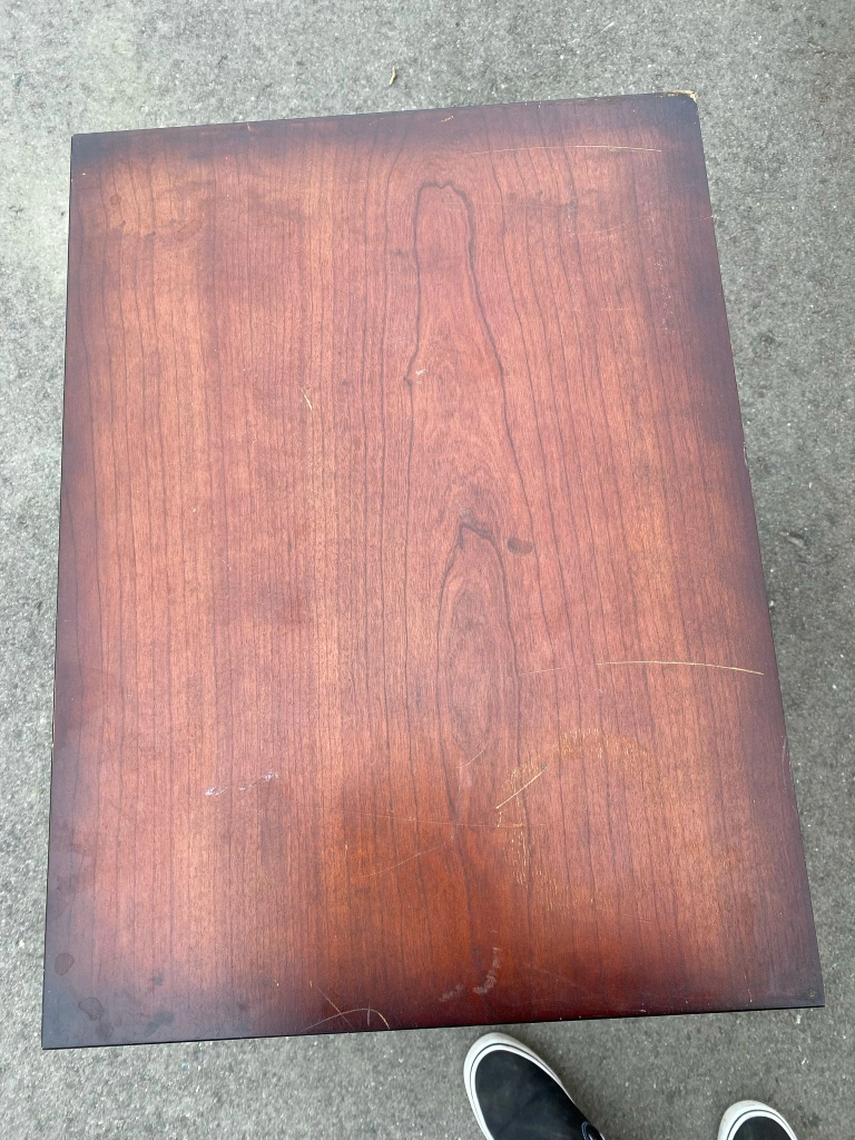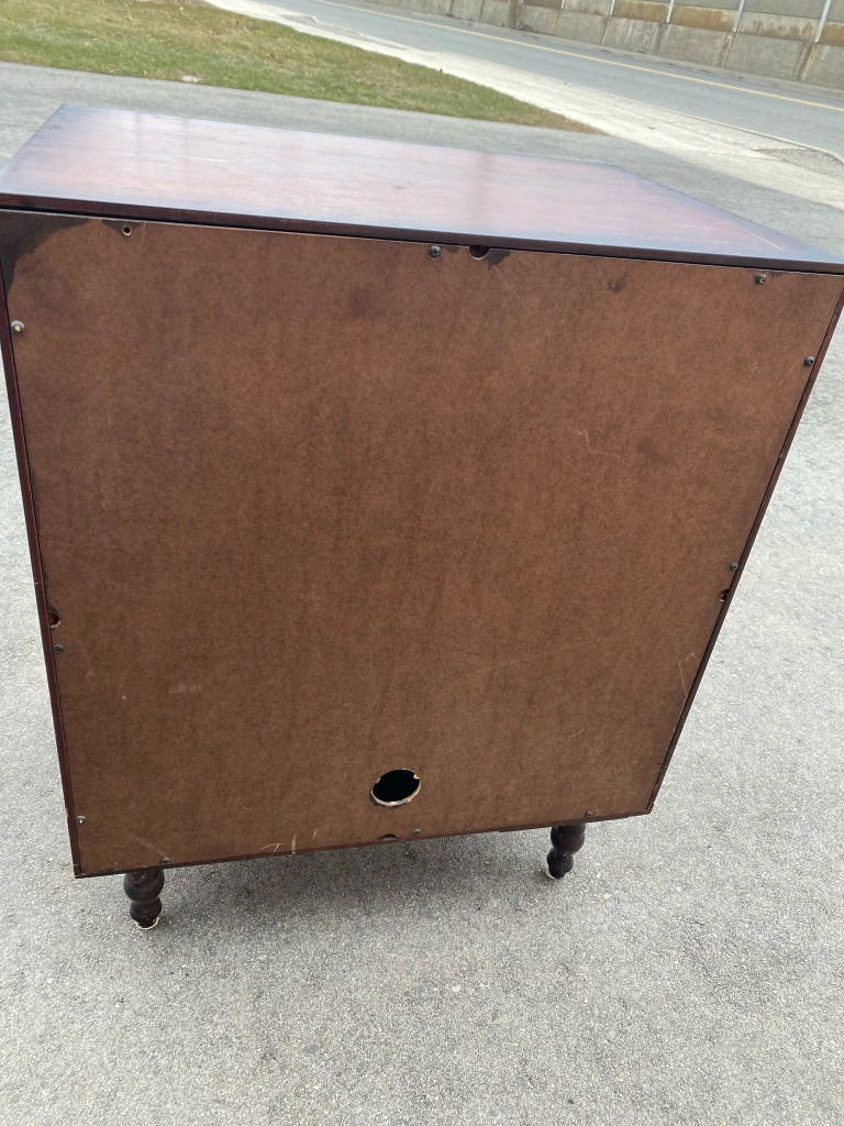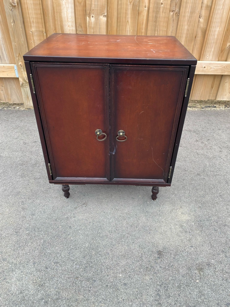 Small, dark wood cabinet. Two doors open to reveal a shelf. Features turned legs. Shows minor wear.