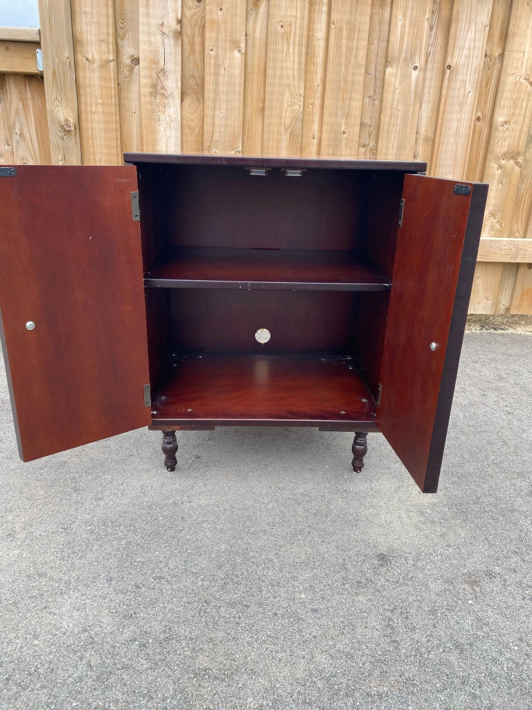 Small, dark wood cabinet. Two doors open to reveal a shelf. Features turned legs. Shows minor wear.