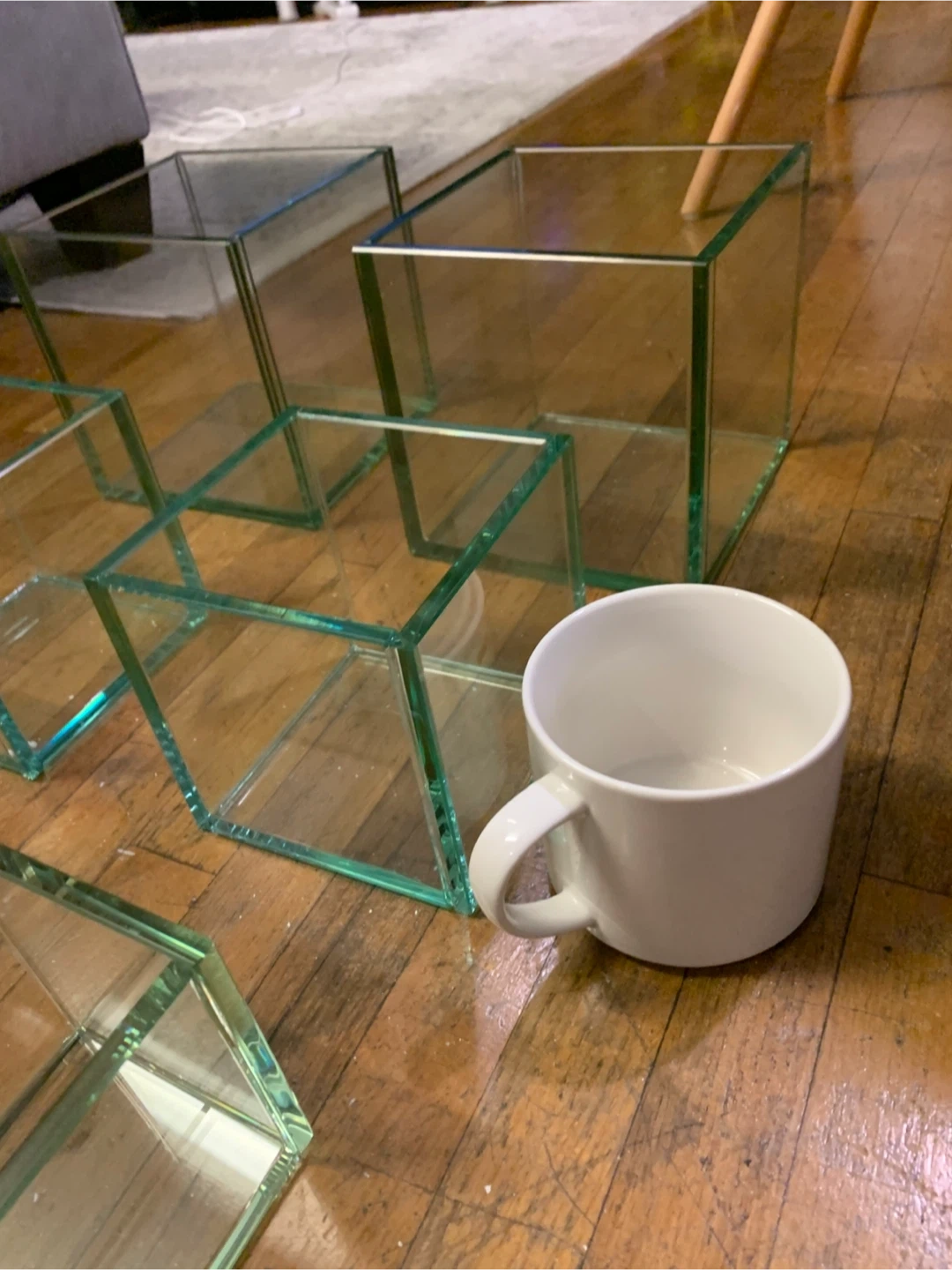 Selling a set of 6 glass display cubes, 2 big , 2 medium , and 2 small .They're in great shape and perfect for showcasing small items or creating a unique display
