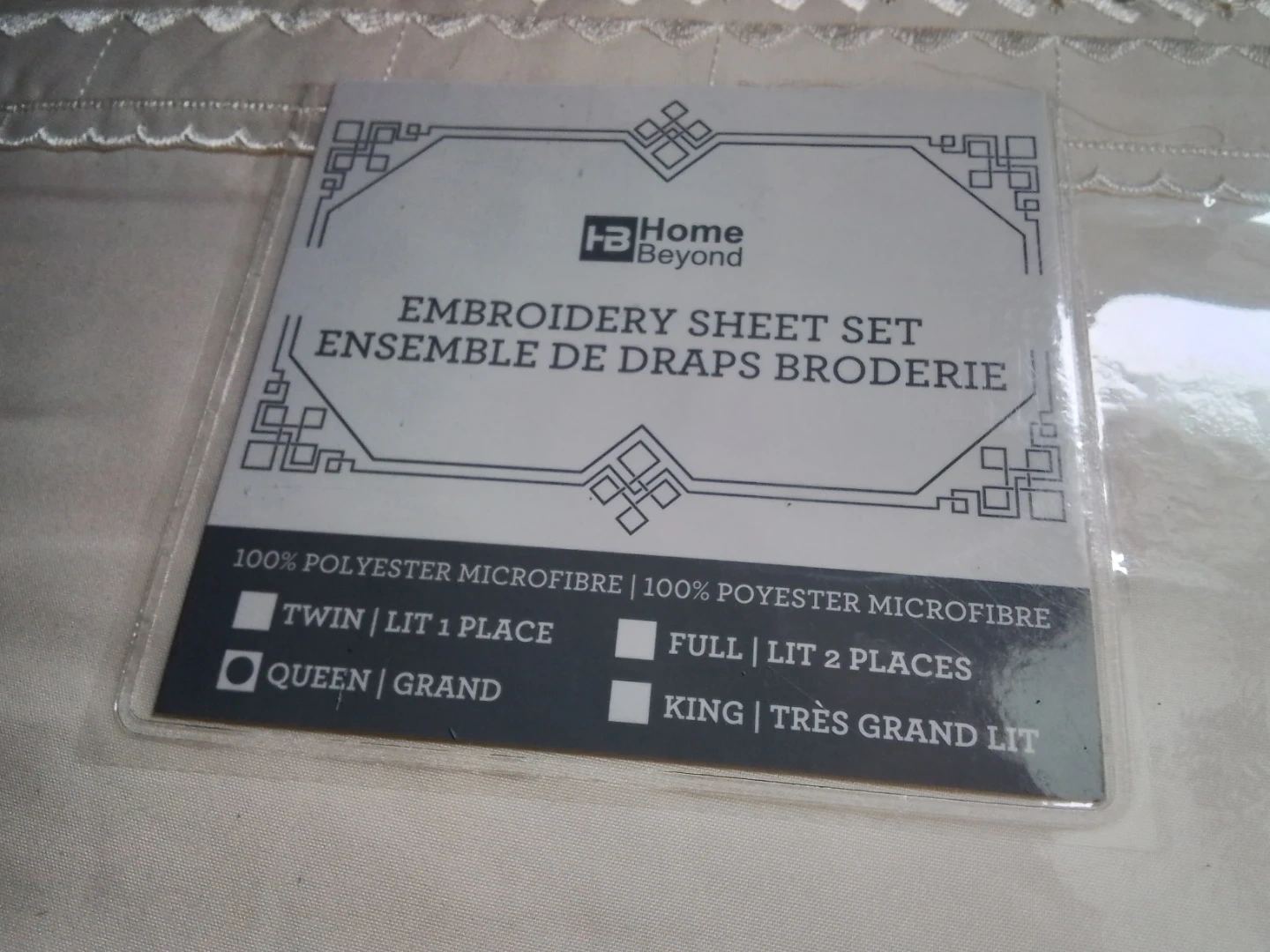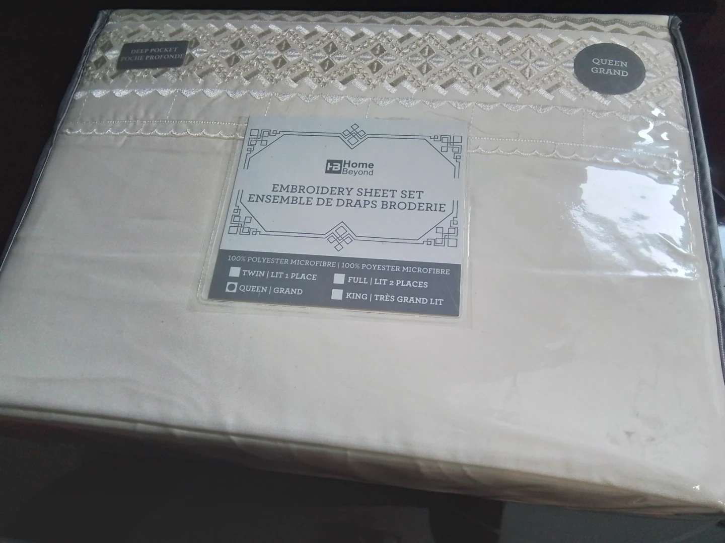 Add a touch of elegance to your bedroom with this new Home Beyond queen-size embroidery sheet set, featuring a stylish design and deep pockets. Made from 100% polyester microfiber, this set includes everything you need for a comfortable night's sleep. A similar set on Kijiji sells for approximately $80.