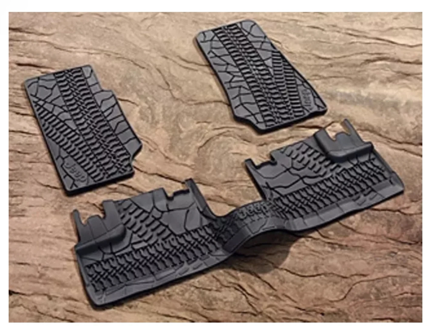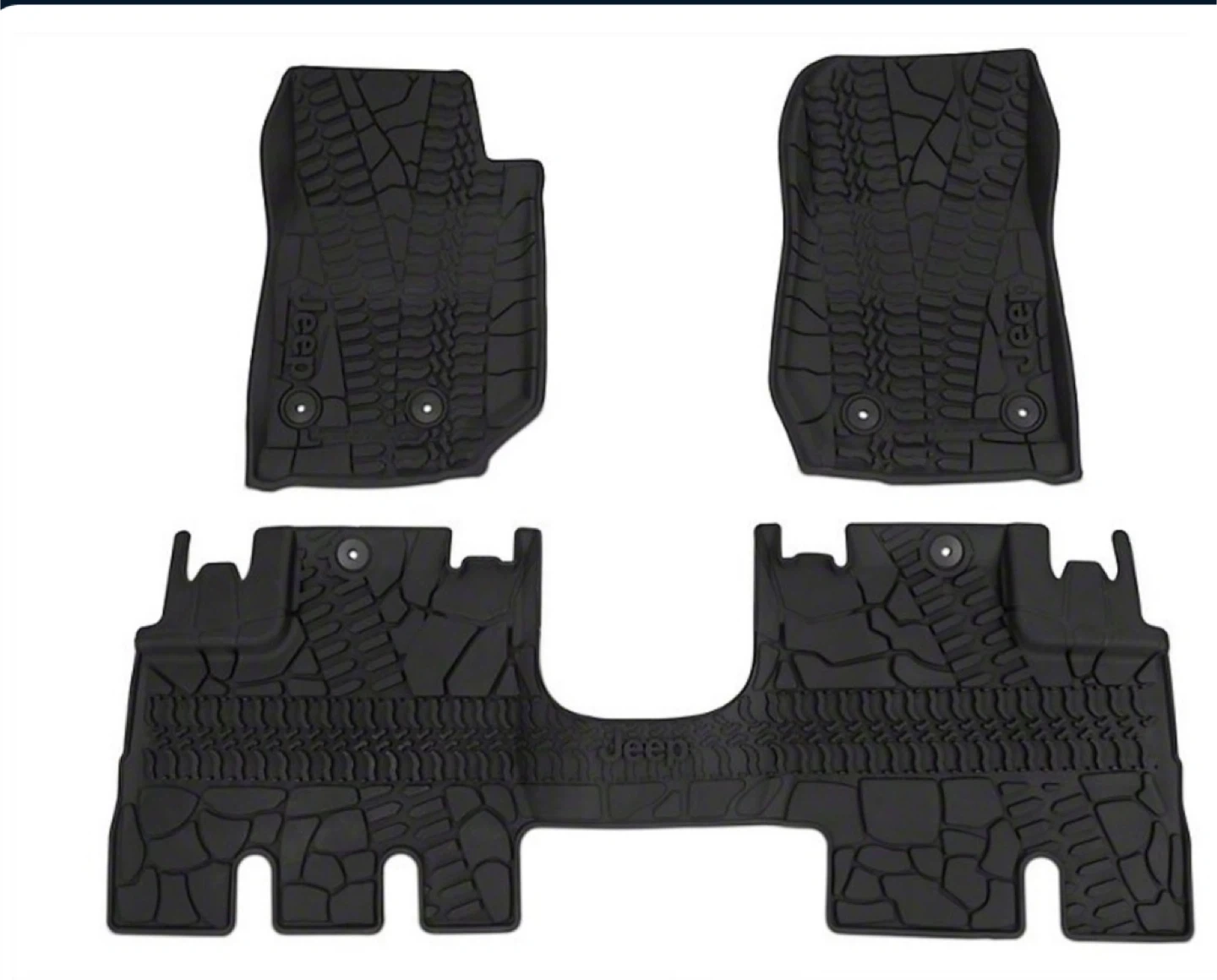 10Selling a set of all-weather Mopar floor mats for a Jeep Wrangler JK. They feature a tire tread pattern and the Jeep logo. Originally bought for $226.69.