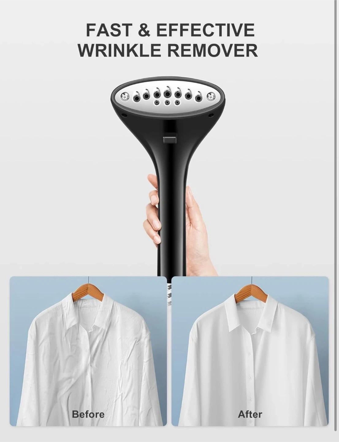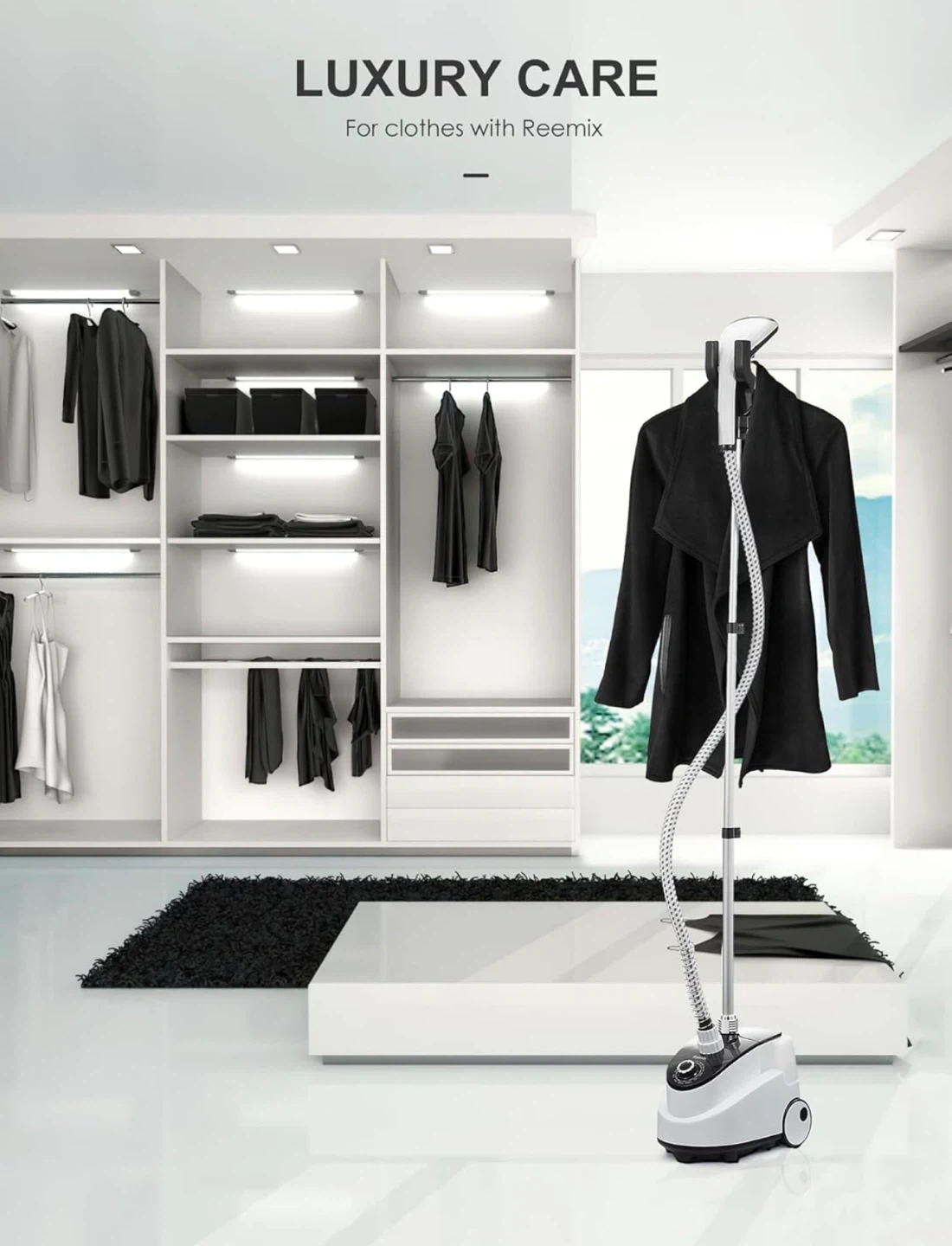 This Reemix garment steamer is designed for fast and effective wrinkle removal. It features a powerful and continuous steam output with 10 steam vents that penetrate deep into fabric. The unit preheats within 30 seconds. It's great for refreshing clothes with luxury care.