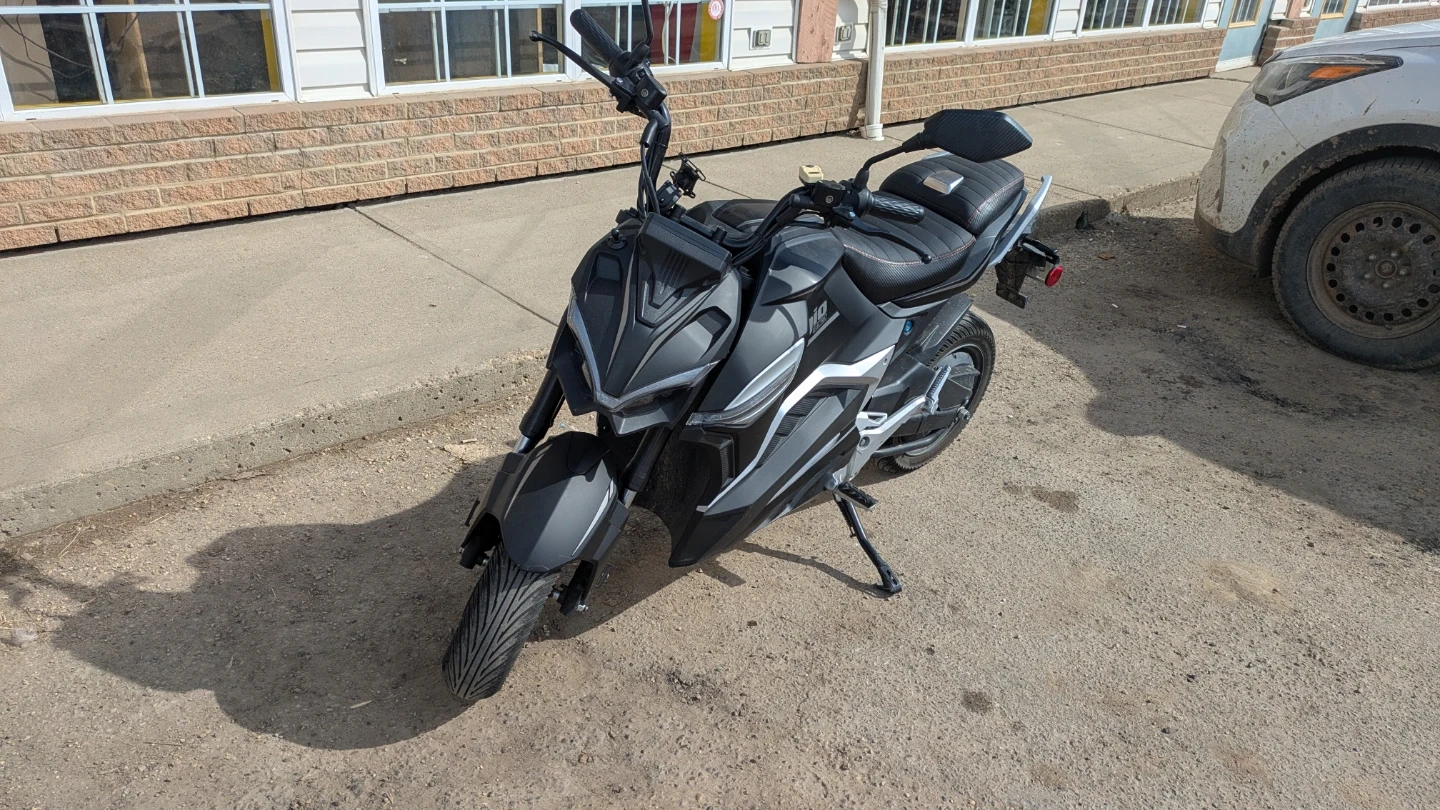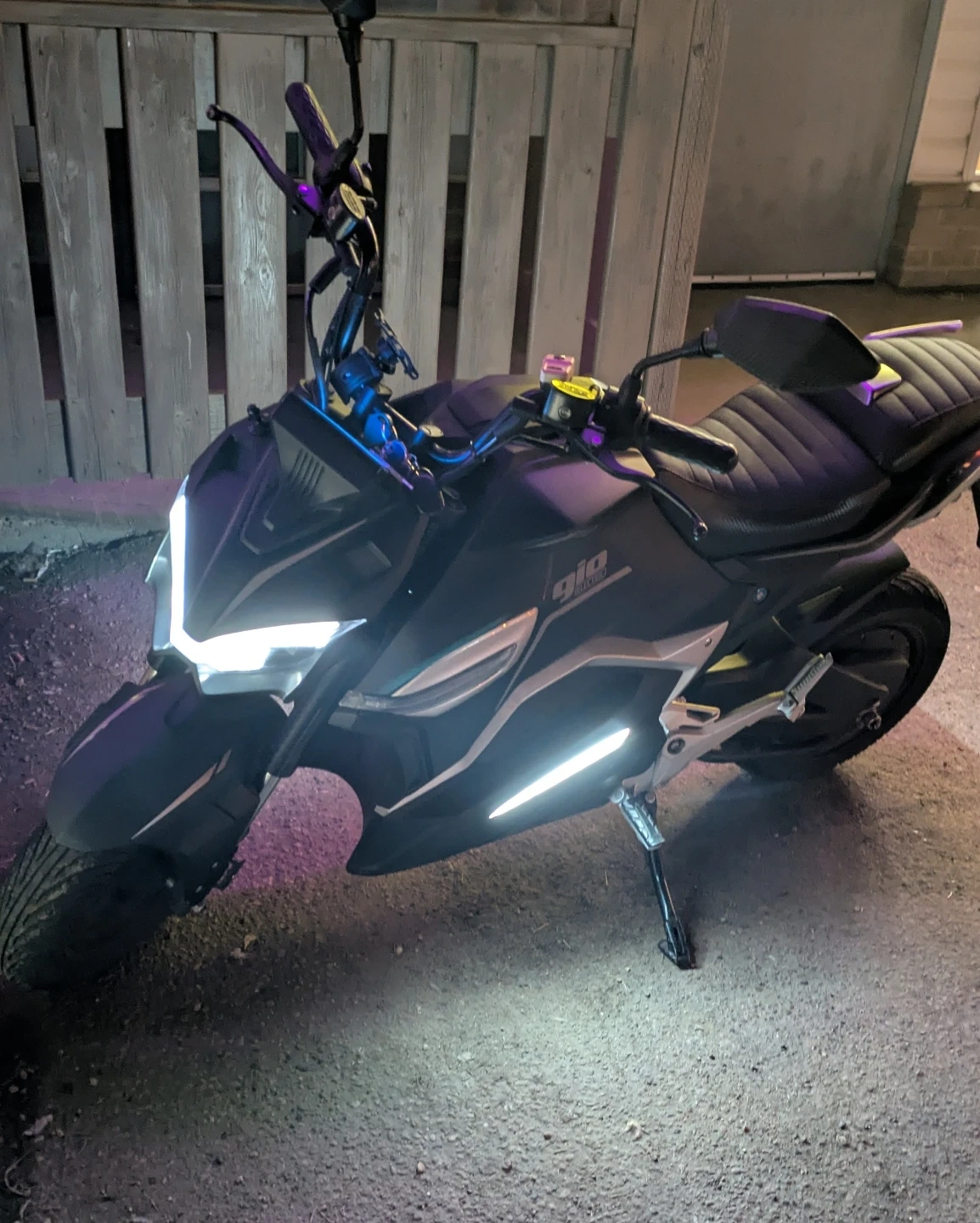 This is a GIO electric motorcycle. It's black with sleek silver accents and bright LED lighting. Has a comfortable padded seat and good tread on the tires.