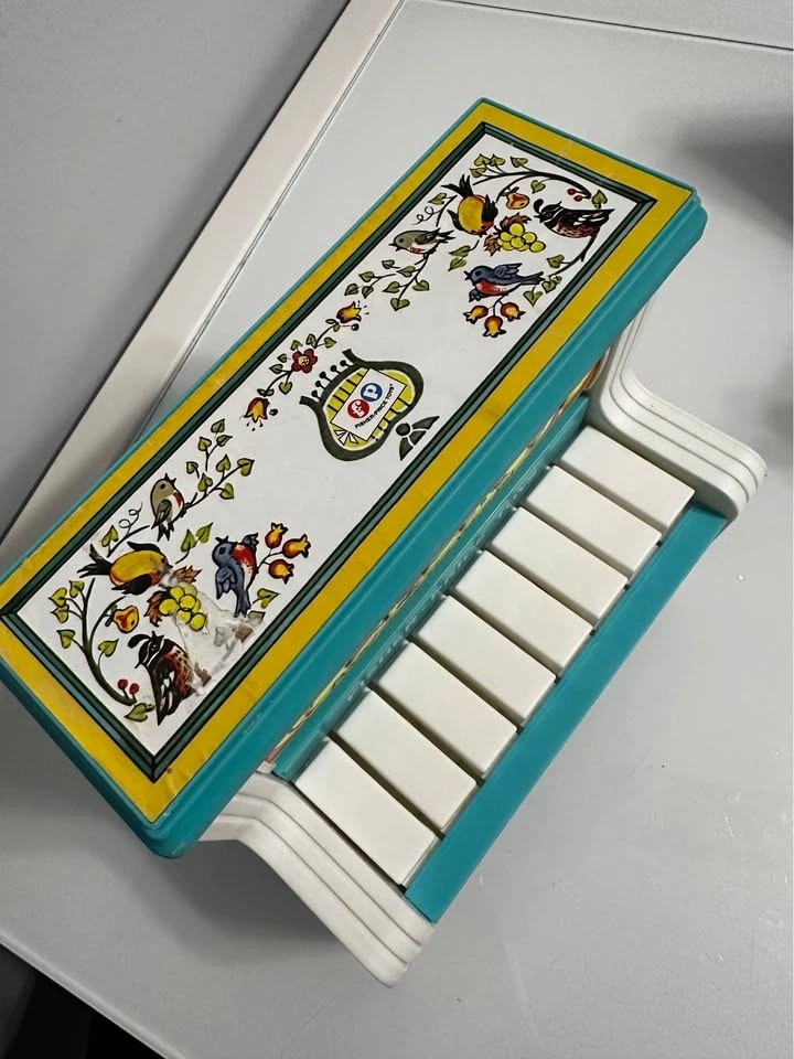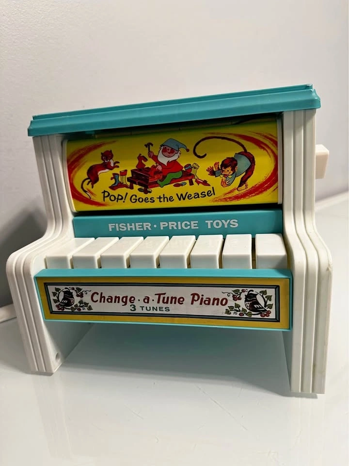 Classic Fisher Price Change-a-Tune Piano. This vintage toy has 3 tunes. Front has the 'Pop! Goes the Weasel' design. Side features a colorful bird and tree graphic. All keys present and clean. Excellent condition. Beautiful melody! Pickup only in COQUITLAM, Westwood Plateau, behind IGA.