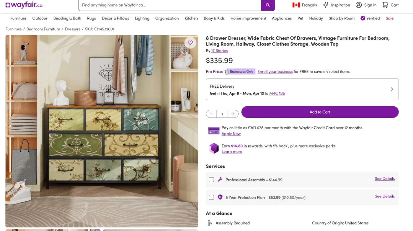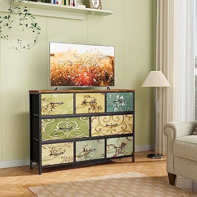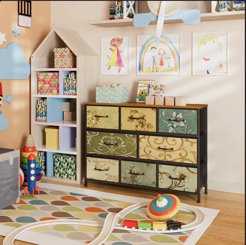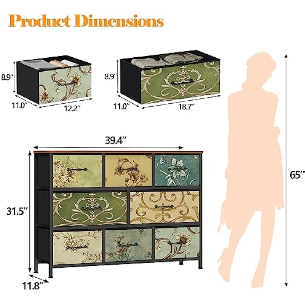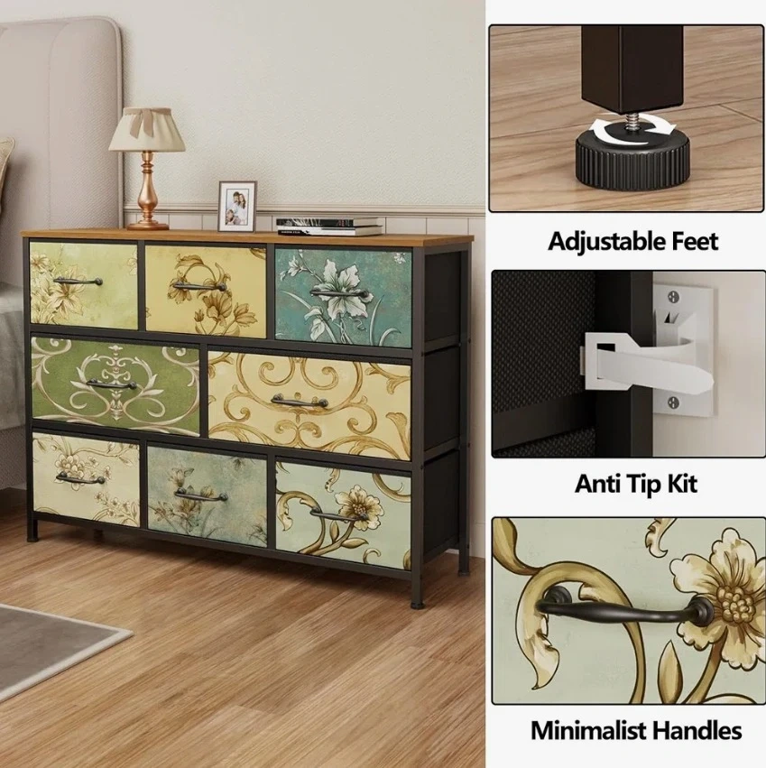 This storage dresser features a unique floral pattern on its nine drawers. It's designed with adjustable feet and includes an anti-tip kit for safety. Minimalist handles complement its decorative design.