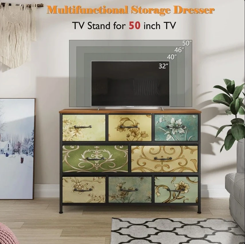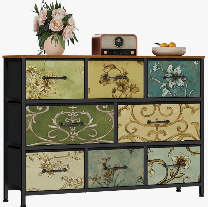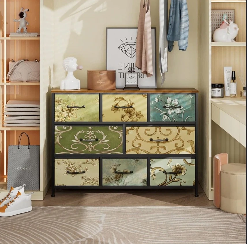 This storage dresser features a unique floral pattern on its nine drawers. It's designed with adjustable feet and includes an anti-tip kit for safety. Minimalist handles complement its decorative design.