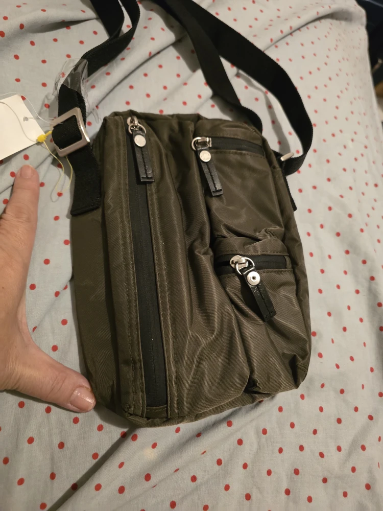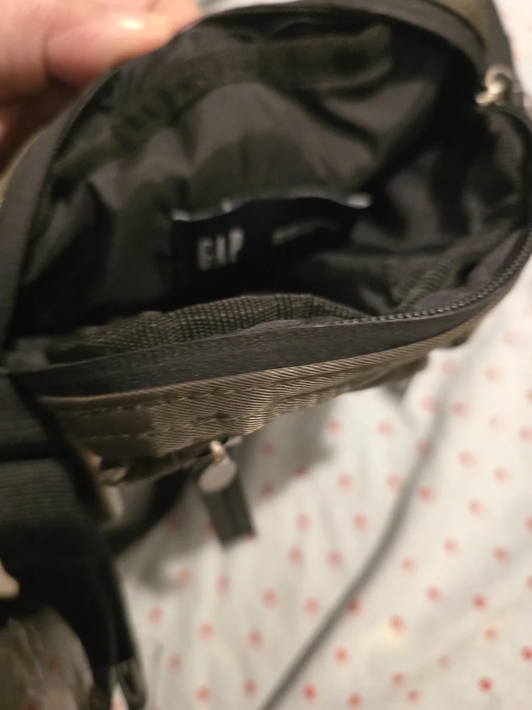 Here's a GAP crossbody bag in olive green! It features multiple zippered compartments, perfect for keeping your essentials organized.