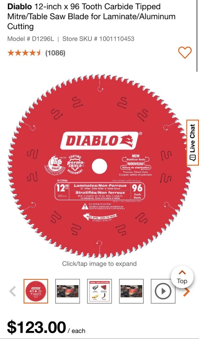 Used Diablo 12-inch x 96 Tooth Carbide Tipped Mitre/Table Saw Blade for Laminate/Aluminum Cutting. In good condition. Perfect for your next project! Blade Diameter: 12 inch, Teeth: 96, Application: Laminate/Aluminum Cutting. If the ad is up, it's available!