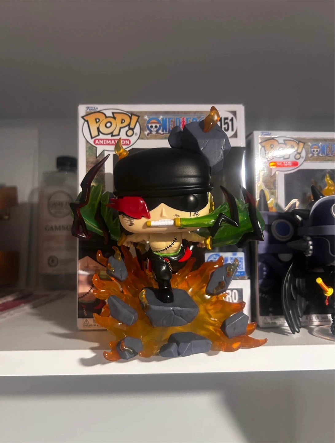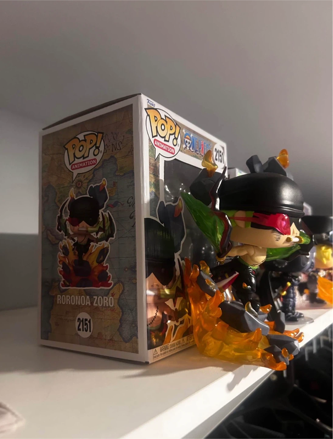 This is a Funko Pop! Animation figure of Roronoa Zoro, number 2151. It depicts Zoro in a dynamic action pose with fiery effects. The figure includes its original box.