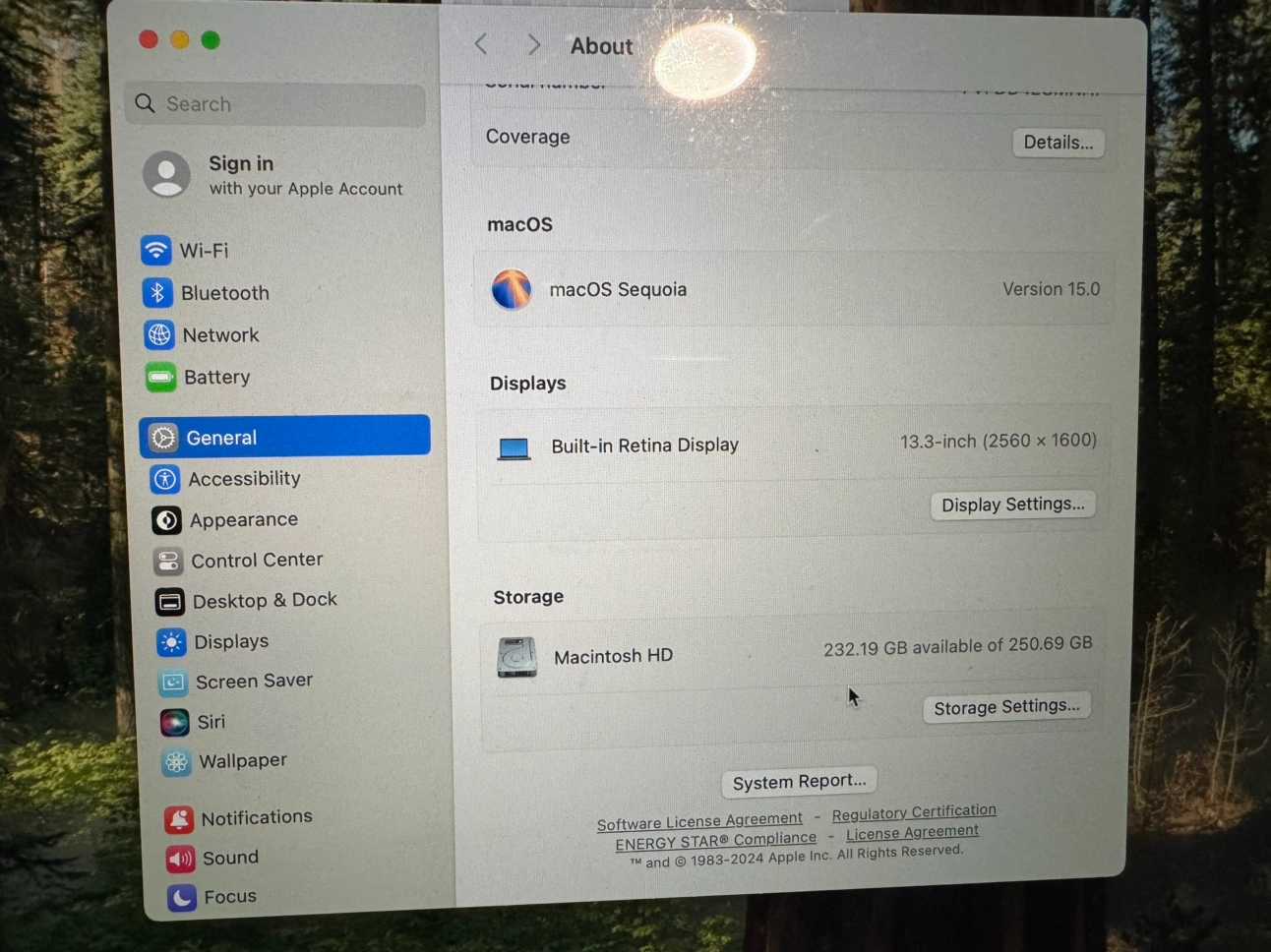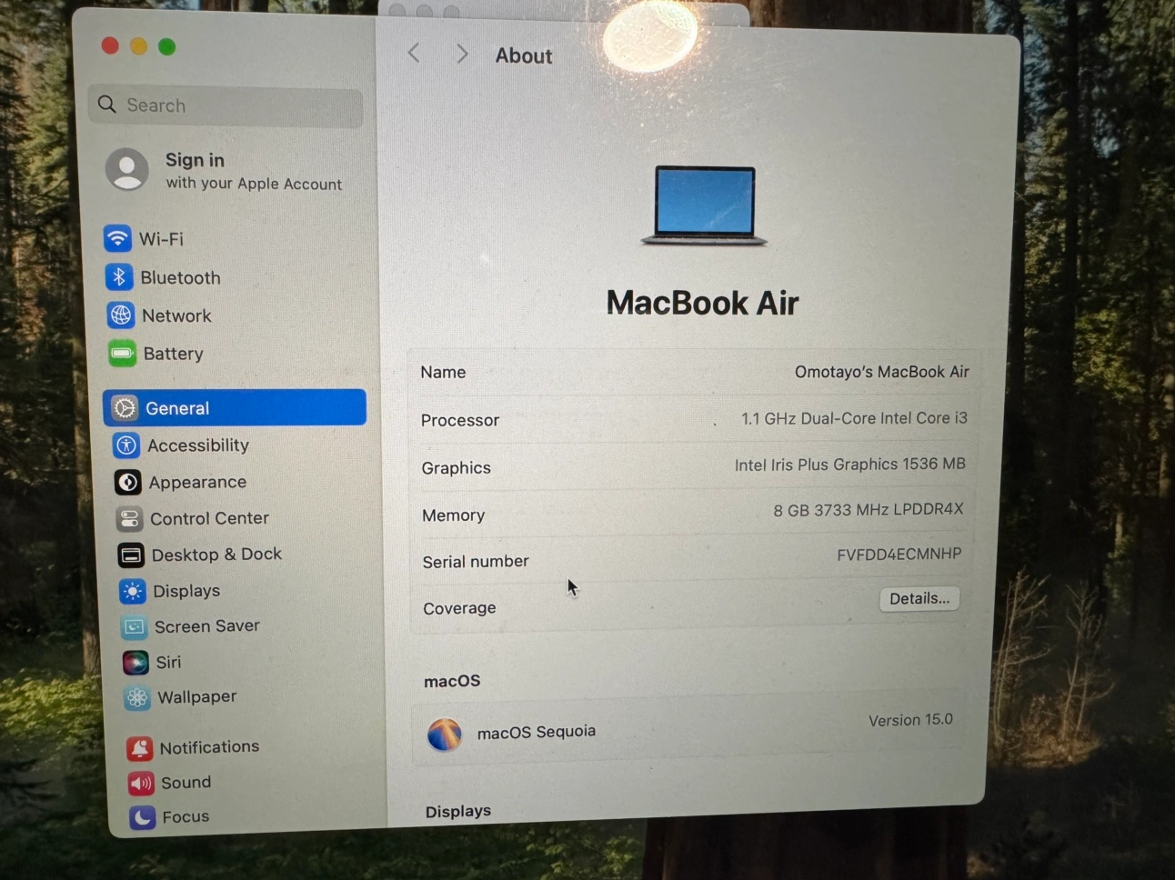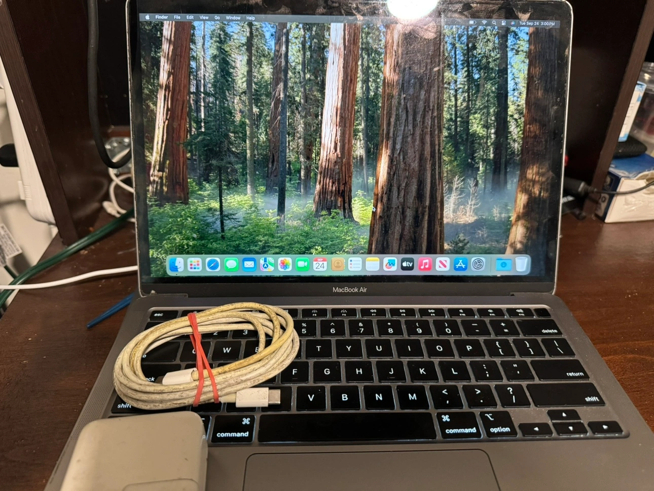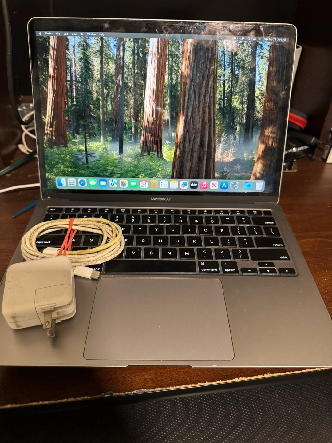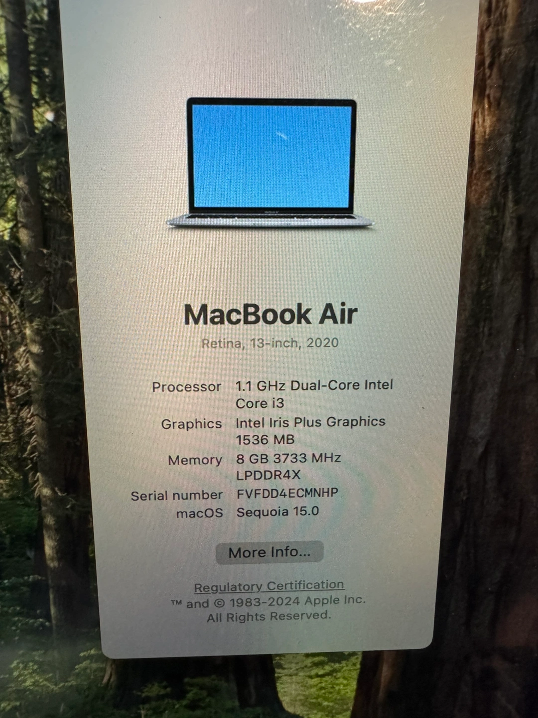 This listing is for a 2020 13-inch Macbook Air with the following specifications: 1.1 GHz Dual-Core Intel Core i3, Intel Iris Plus Graphics 1536 MB, 8 GB 3733 MHz LPDDR4X, 250 GB Macintosh HD. Comes with a power adapter.
