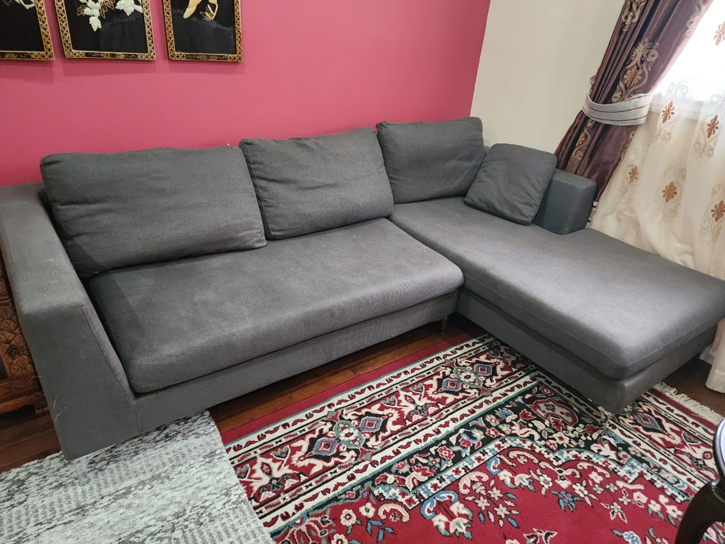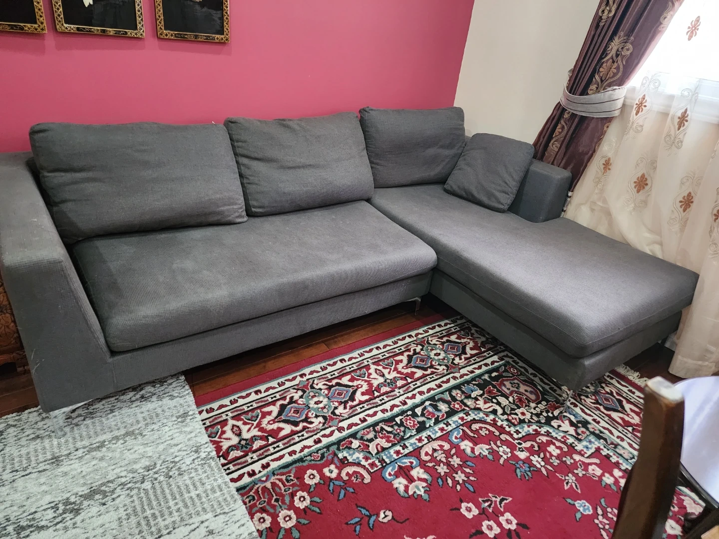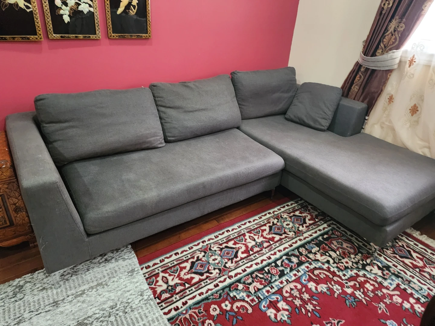 This is a comfortable grey sectional sofa with a chaise lounge. It's upholstered in a durable fabric. Ample seating for a living room!