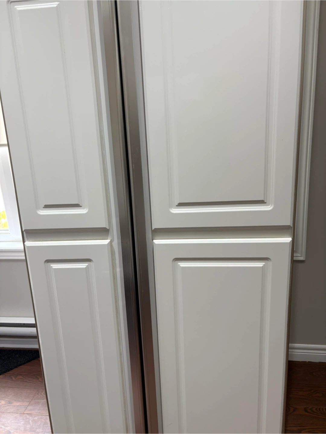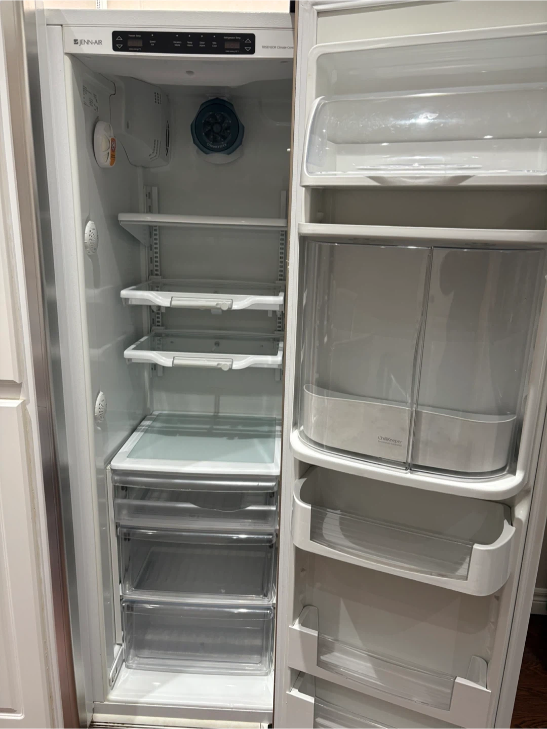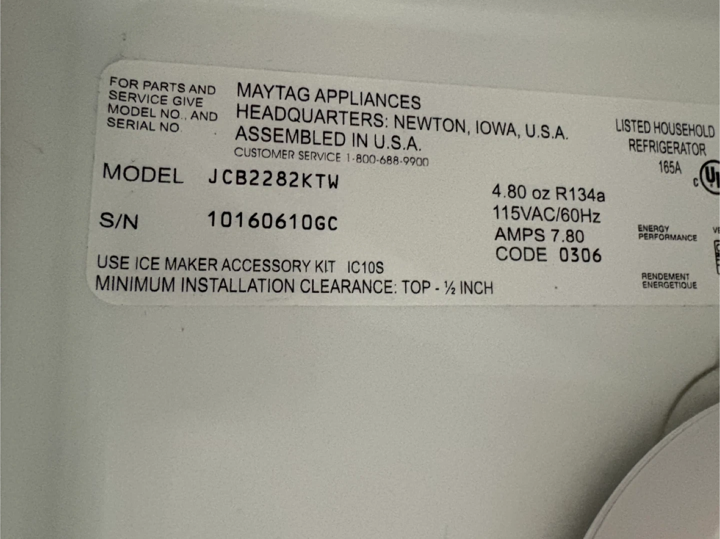 5Selling a Jenn-Air 22 cu. ft. side-by-side refrigerator. It has a fresh food capacity of 13.51 cu. ft. and a freezer capacity of 7.96 cu. ft. The total capacity is 21.5 cu. ft. Dimensions are: Cabinet height with hinge 70 in., width 35 5/8 in., and cabinet depth with handle 29 1/4 in. Model number is JCB2282KTW