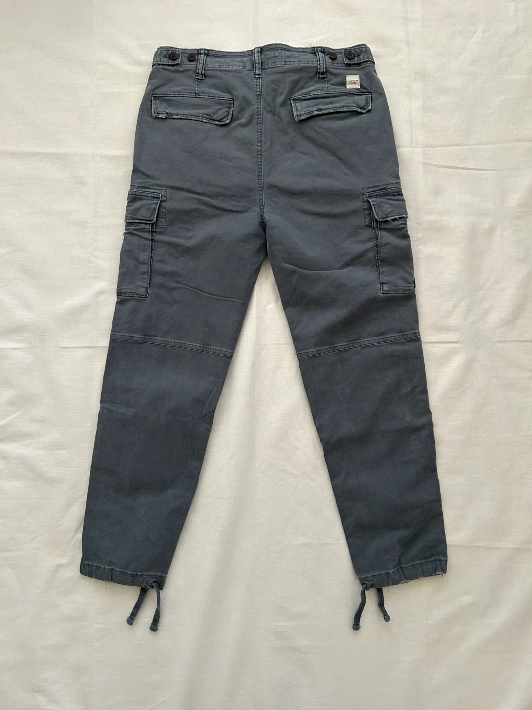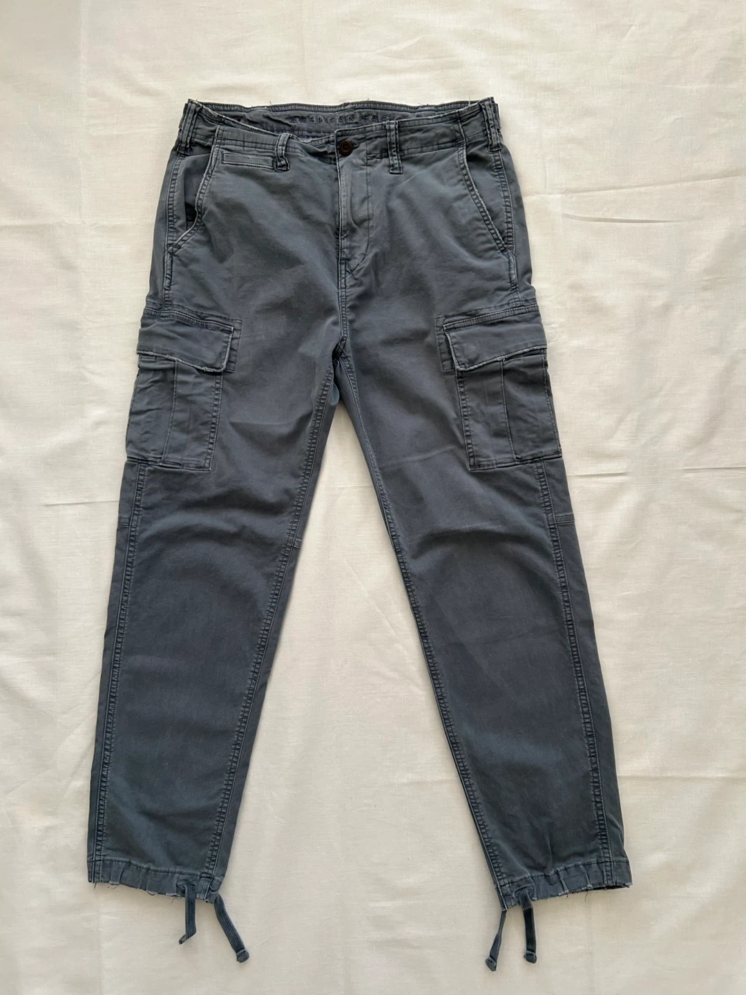 Selling a pair of American Eagle Outfitters Flex cargo pants. They are size 32x32. The material is 92% cotton / 5% recycled cotton / 3% elastane.