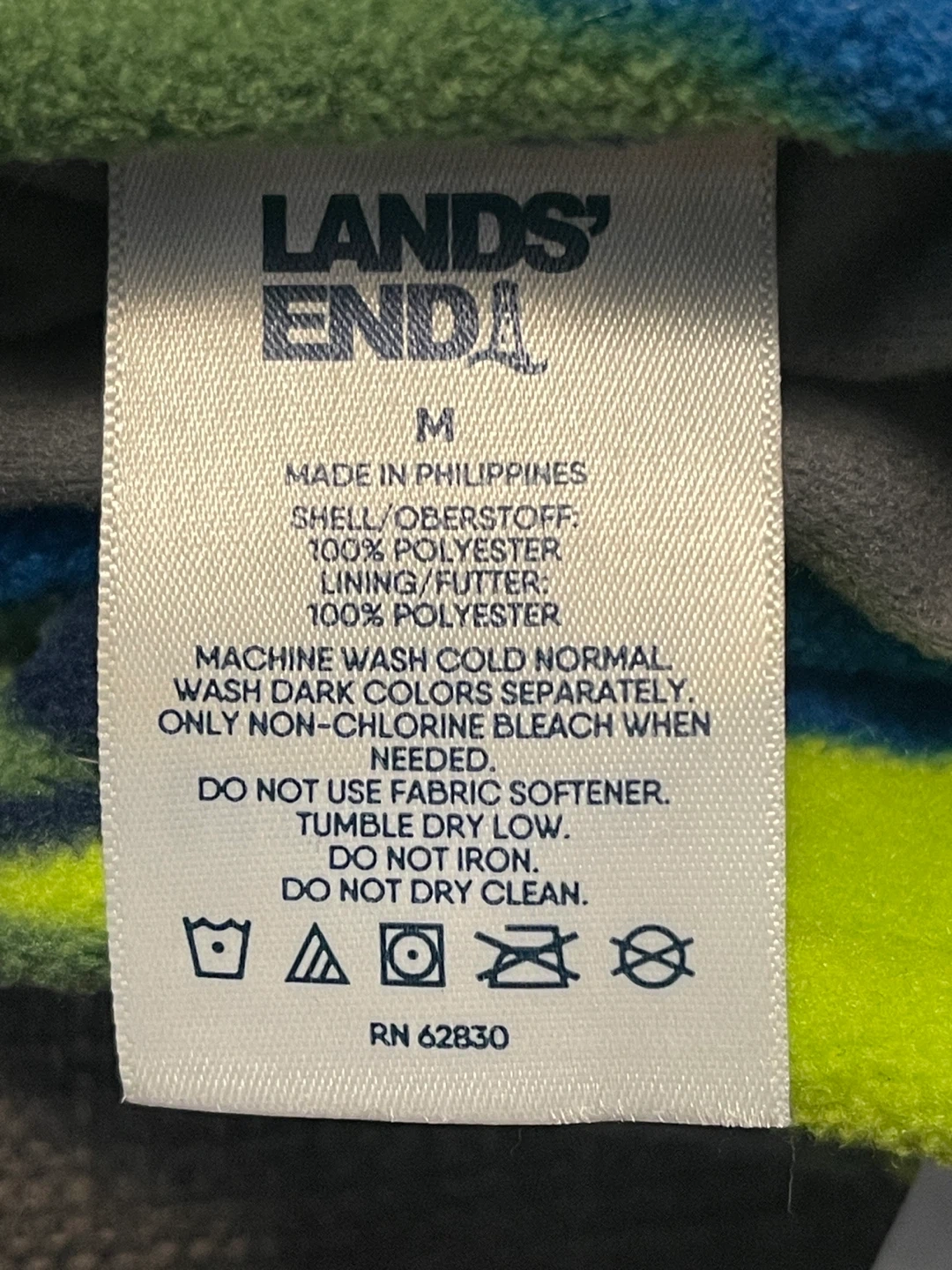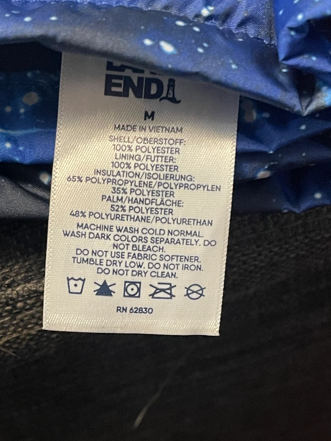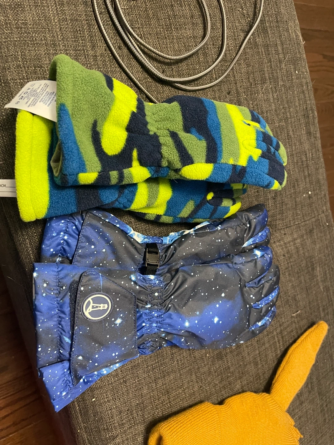 Lands' End youth gloves in size M. Features a camouflage pattern on one pair and a blue starry sky pattern on the other. Made with 100% polyester shell and lining. These are great for keeping little hands warm during colder weather!