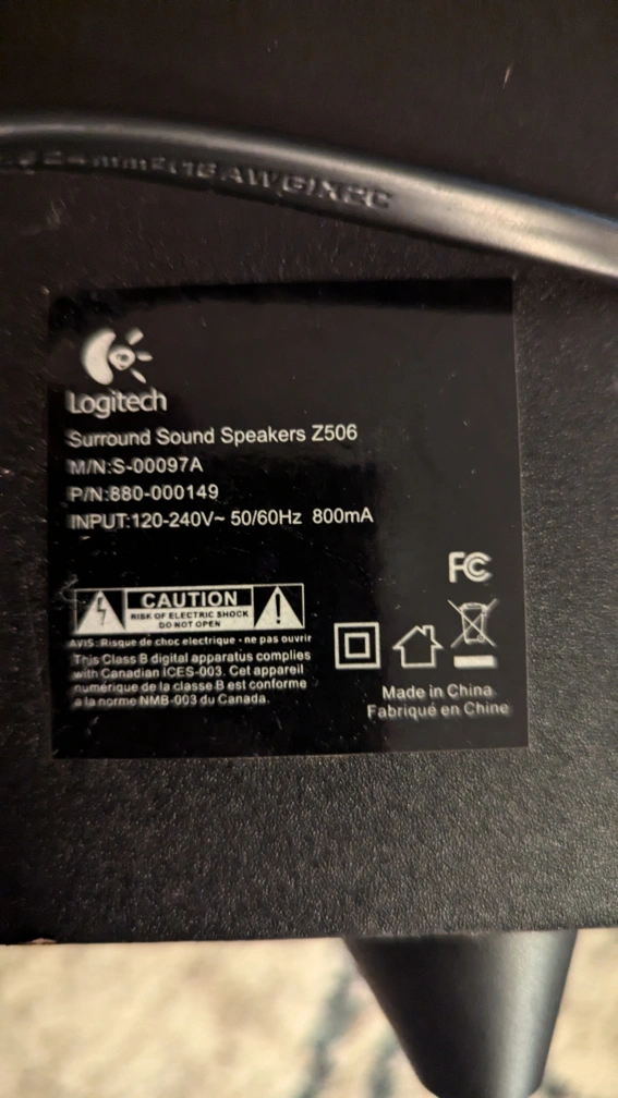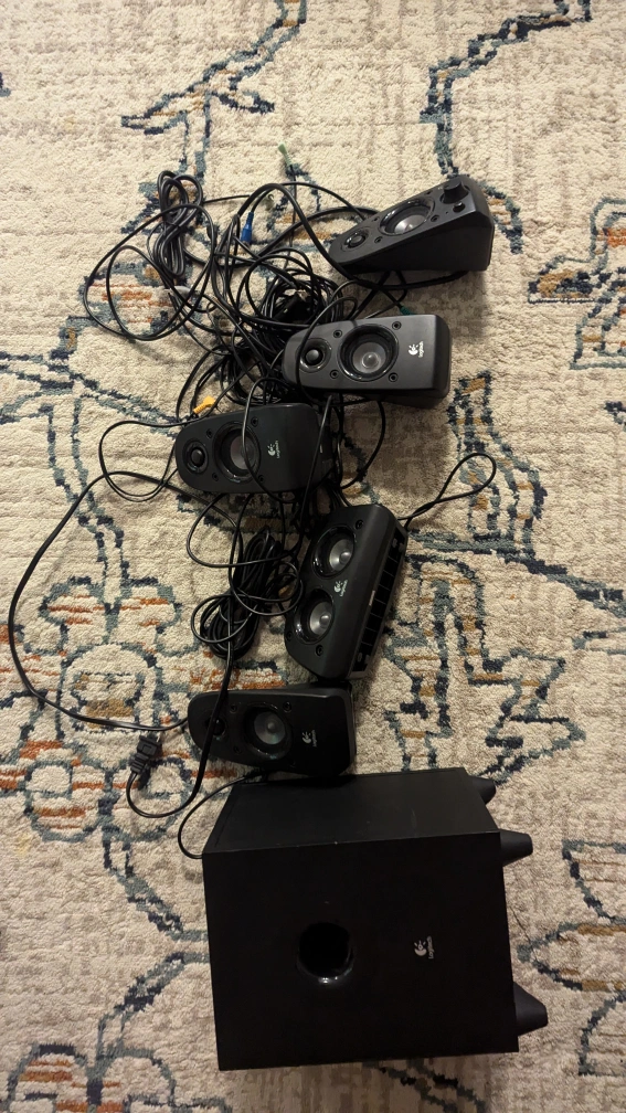 Logitech Z506 5.1 Surround Sound Speaker System. It includes a subwoofer and five satellite speakers. It also has a 3.5mm input jack and a RCA input jack on the back of the subwoofer. This system is perfect for your computer or your television.