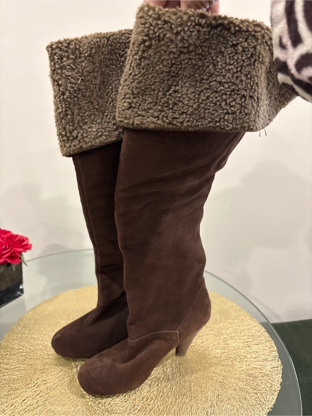 Brand New Selling a pair of brown suede knee-high boots! They feature a stylish suede exterior and a comfortable fit. The heel height is approximately 3 inches. Perfect for adding a touch of elegance to your wardrobe!
