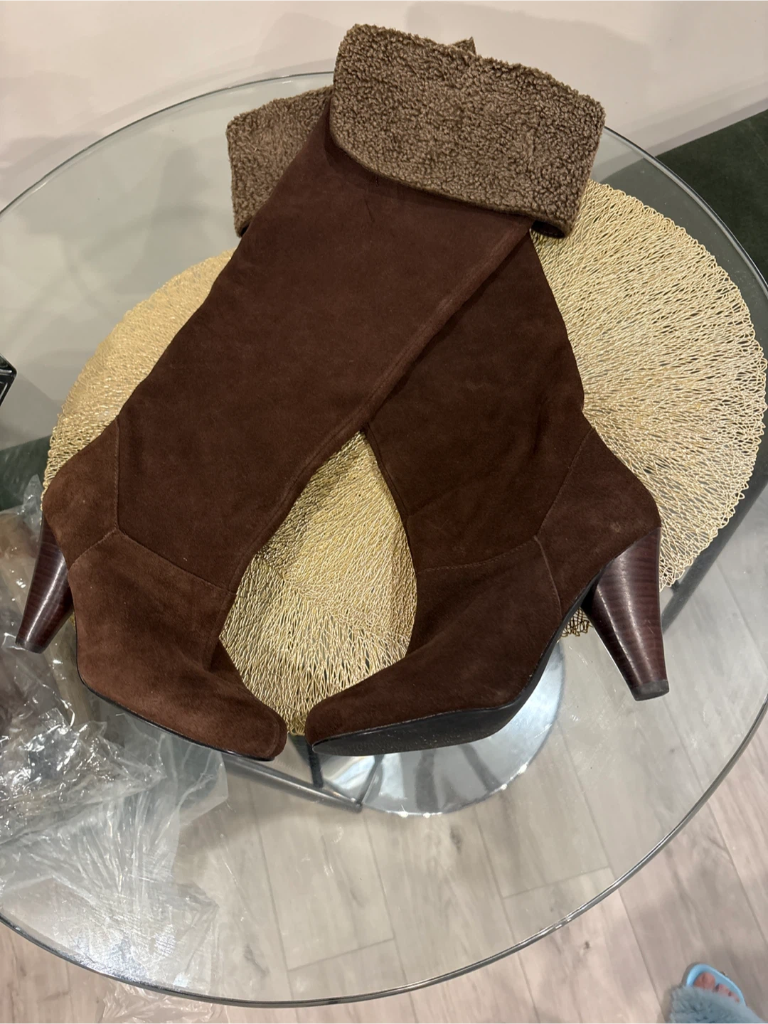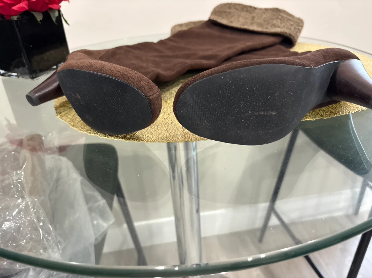 Brand New Selling a pair of brown suede knee-high boots! They feature a stylish suede exterior and a comfortable fit. The heel height is approximately 3 inches. Perfect for adding a touch of elegance to your wardrobe!