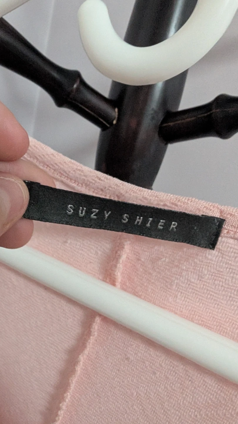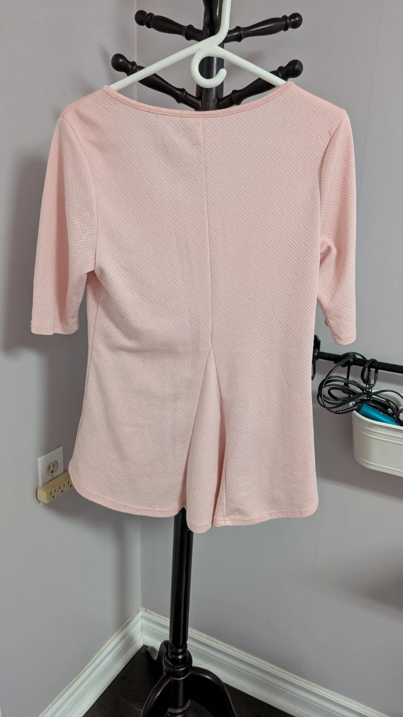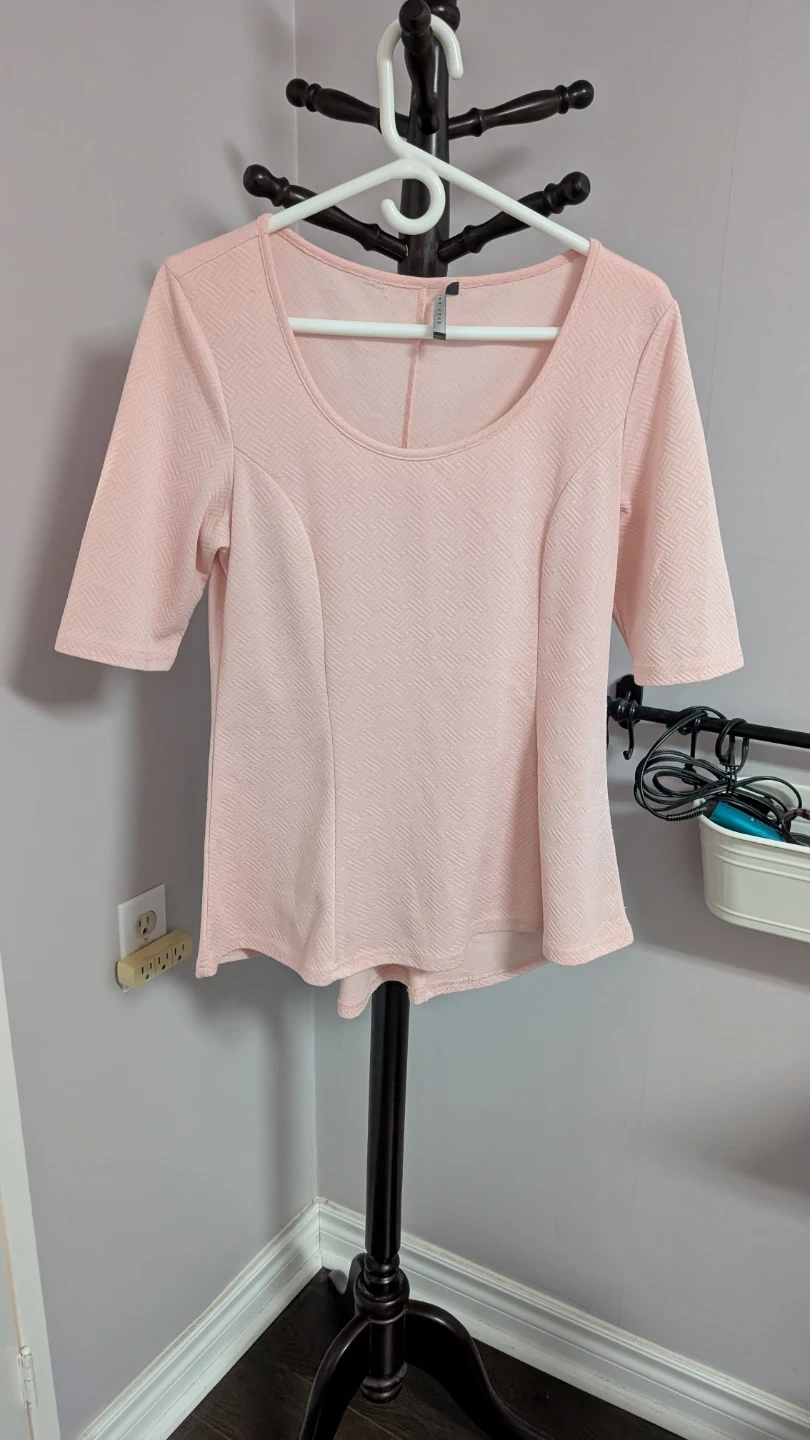 This Suzy Shier top is a lovely pastel pink. It features a subtle textured pattern throughout the fabric. Fits M to L.