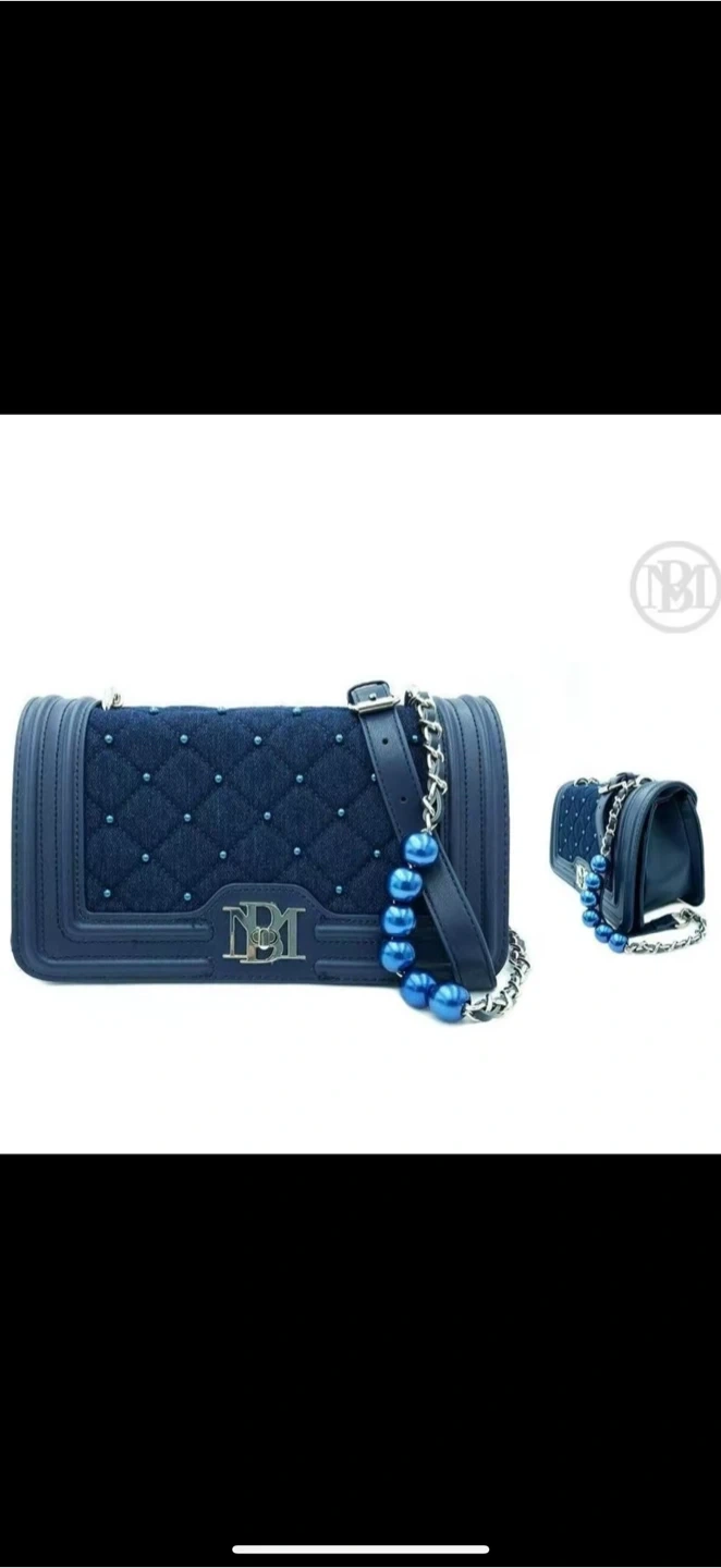 Chic blue denim quilted shoulder bag. Features a decorative pearl and chain strap. Includes a front logo detail. It's a stylish accessory for any outfit!