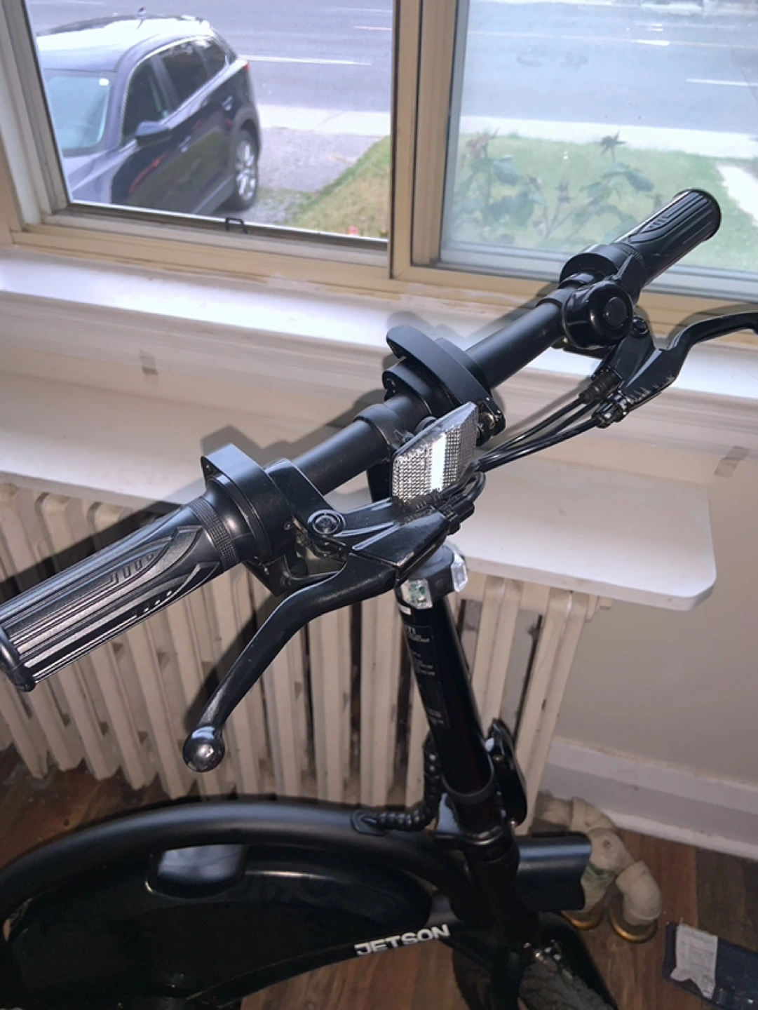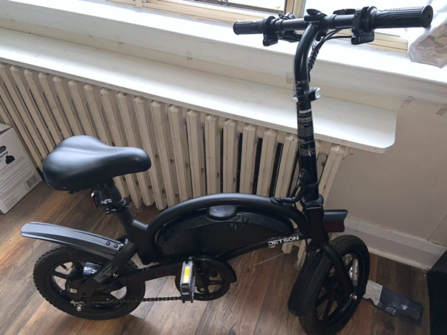 Black electric bike with front and rear fenders and a chain drive. Has front and rear lights and a horn.