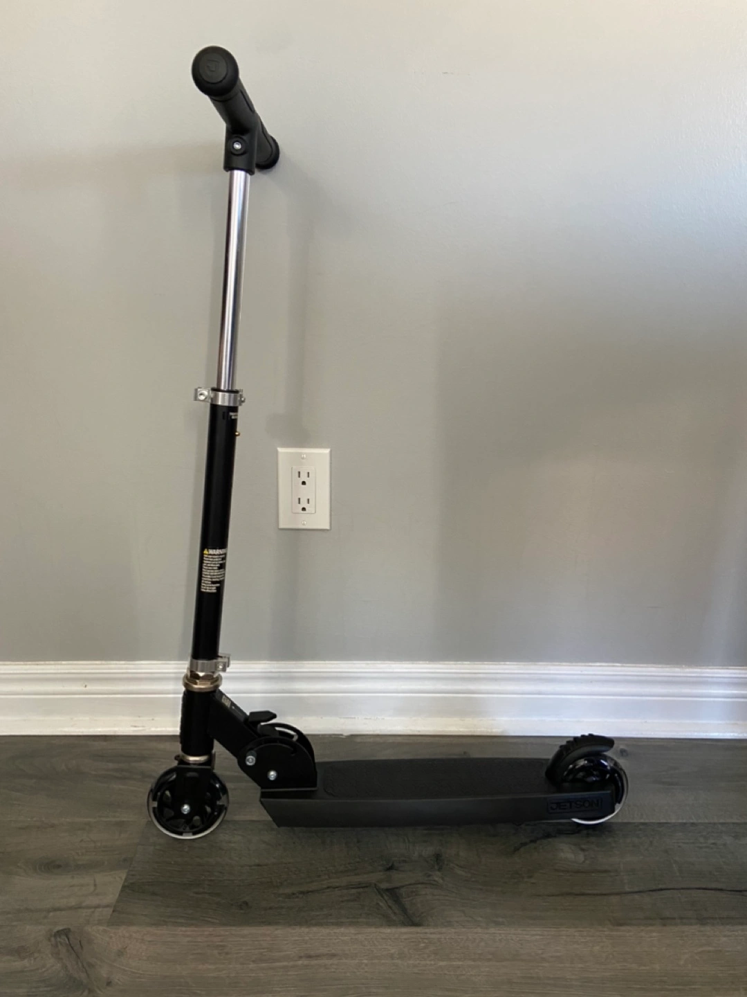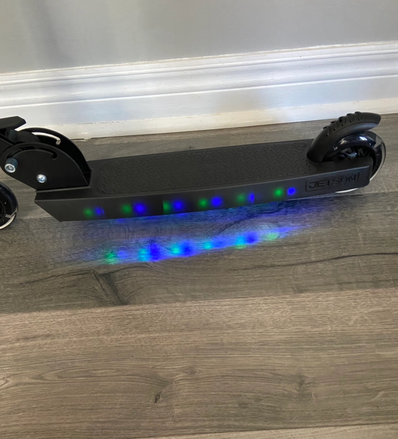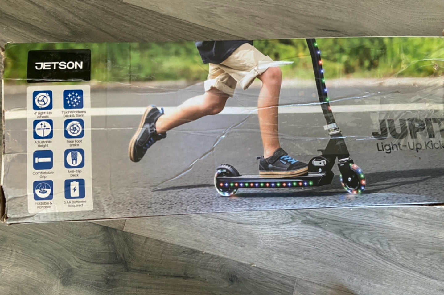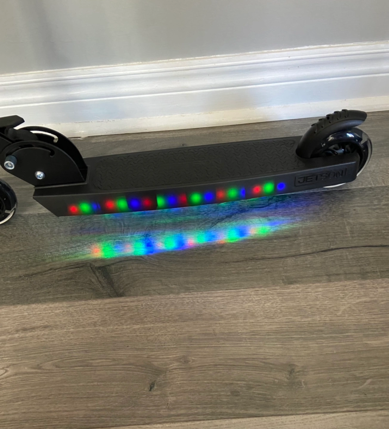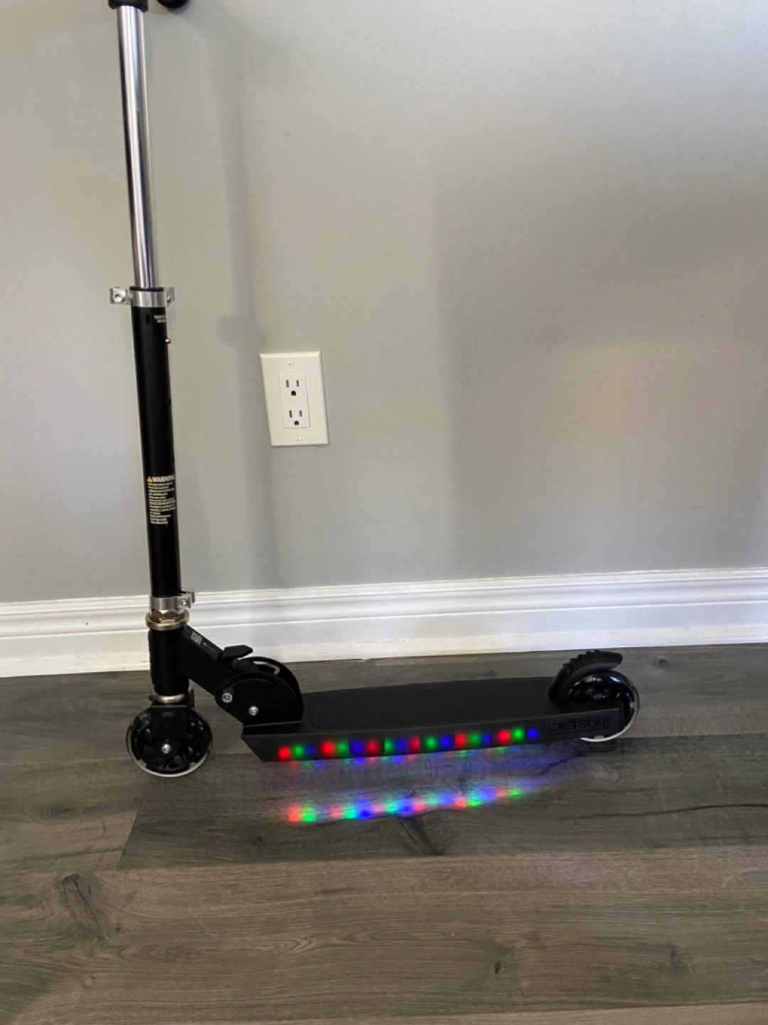 Black kids scooter. Features adjustable height, rear foot brake, and light-up deck. Seven light patterns. Foldable and portable. Brand New, Never used Located in Bowmanville