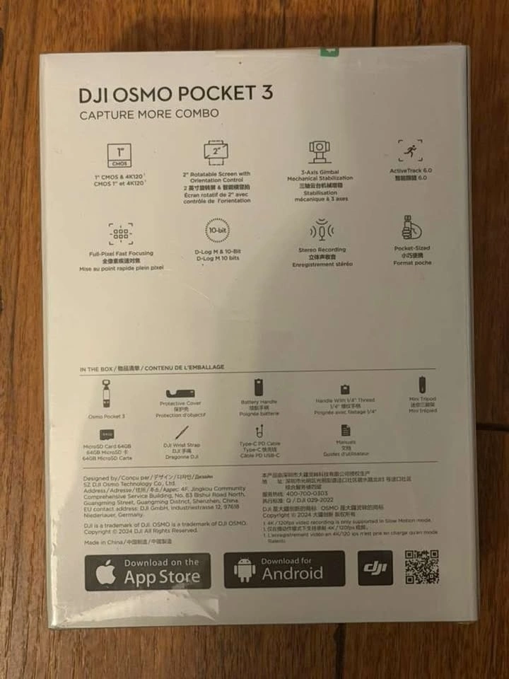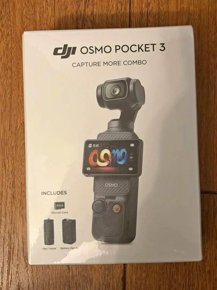 DJI Osmo Pocket 3 Capture More Bundle. Includes: 64GB SD card, Battery Handle and Mini Tripod, Protective Cover, Battery Handle with 1/4" Thread and wrist strap.