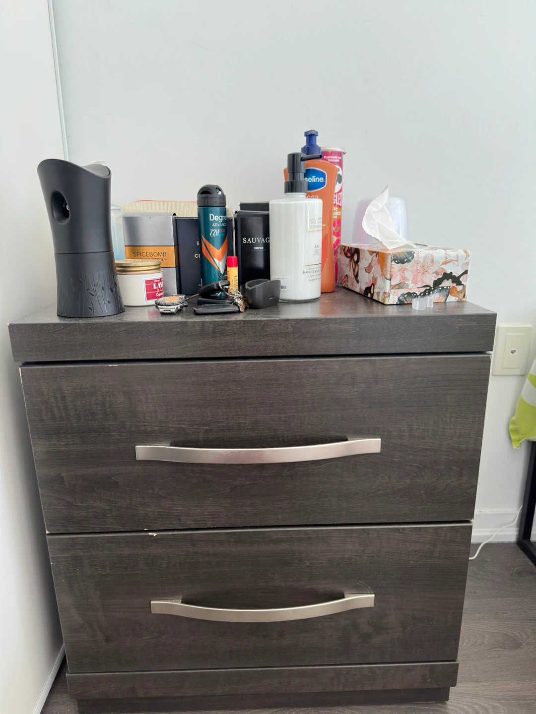 This dark brown 2-drawer nightstand adds both style and function to your bedroom.