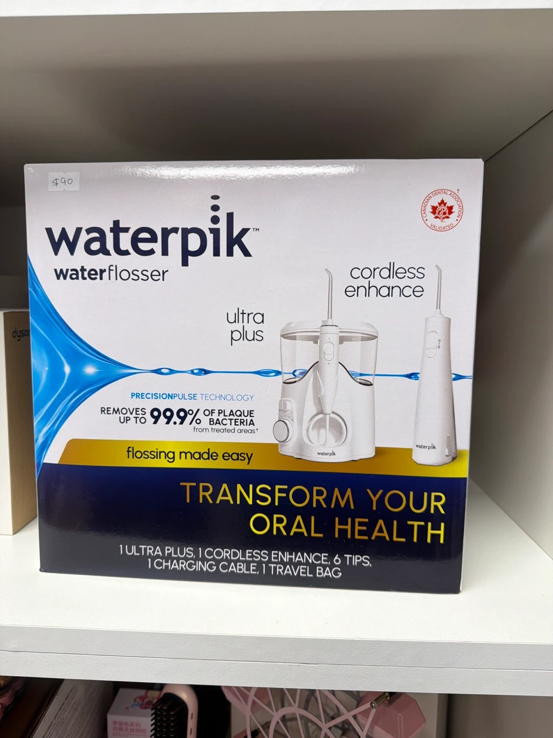 Waterpik Ultra Plus cordless water flosser. Removes up to 99.9% of plaque bacteria. Includes 1 Ultra Plus, 1 Cordless Enhance, 6 tips, 1 charging cable, and 1 travel bag.