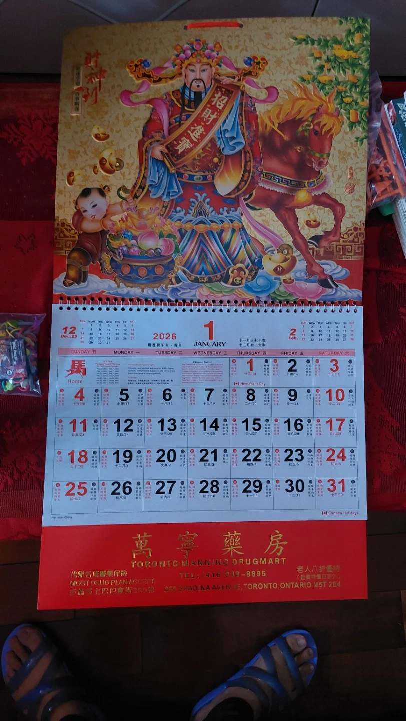 This is a 2026 wall calendar that features traditional New Year's motifs with the God of Prosperity and Year of the Horse in vibrant colours. The calendar includes both Gregorian and Lunar dates and tear-away pages when the month is over