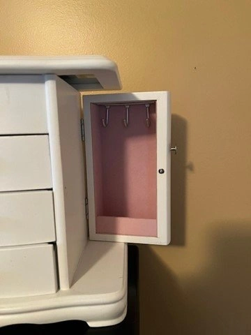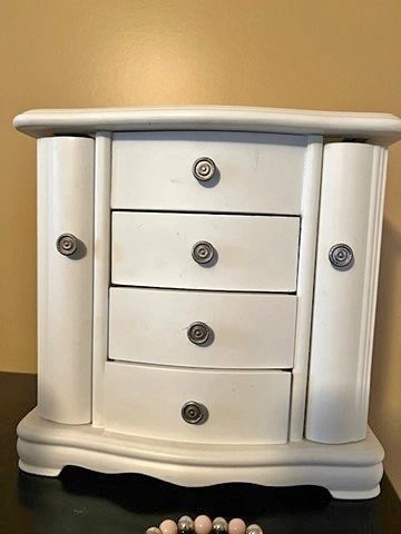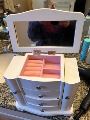 White jewelry box in good condition. Includes compartments for rings, necklaces, and other treasures.