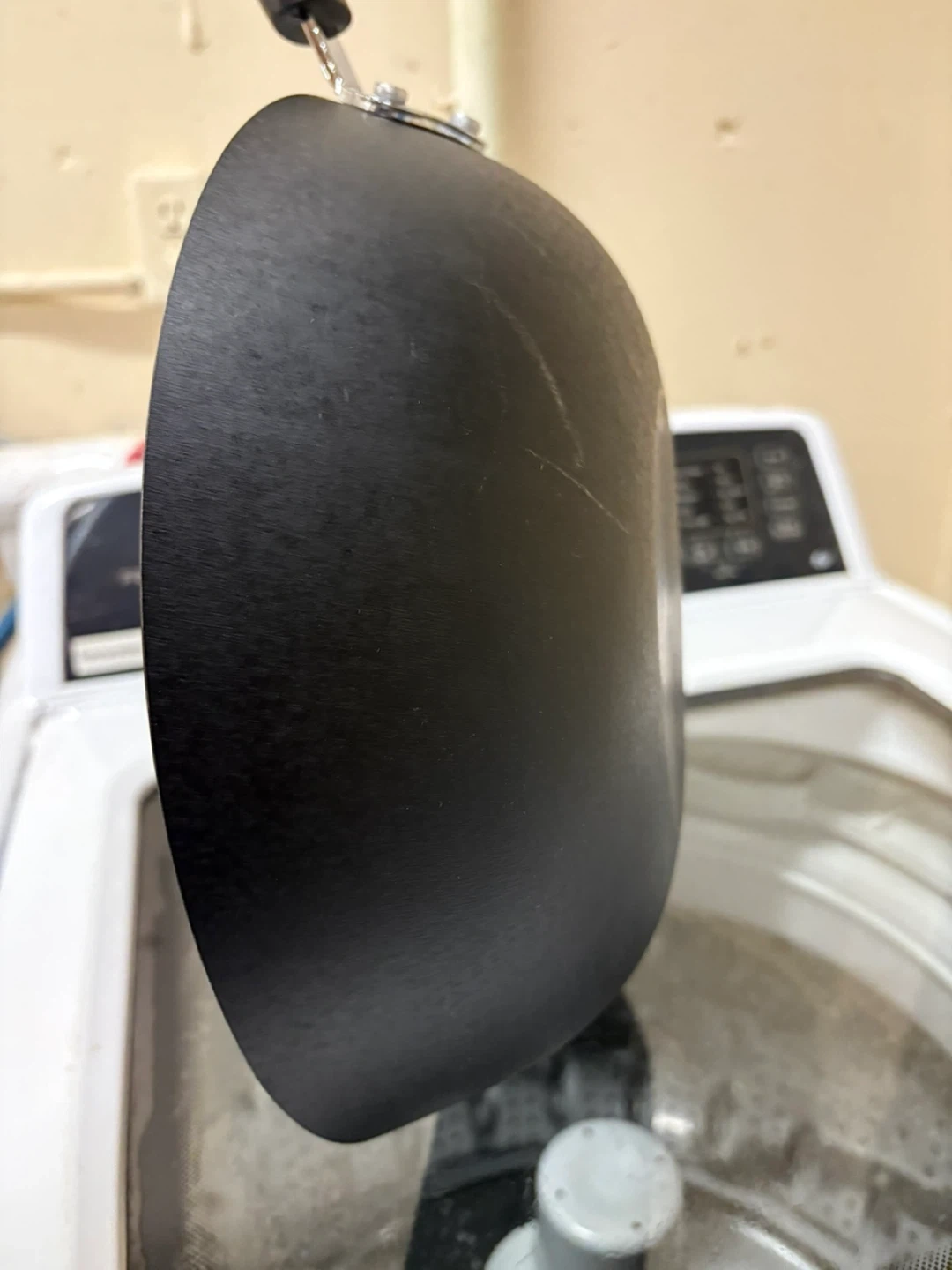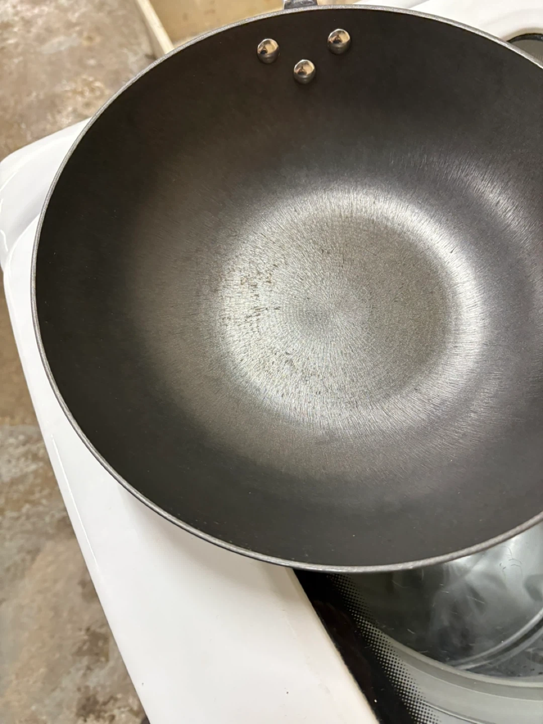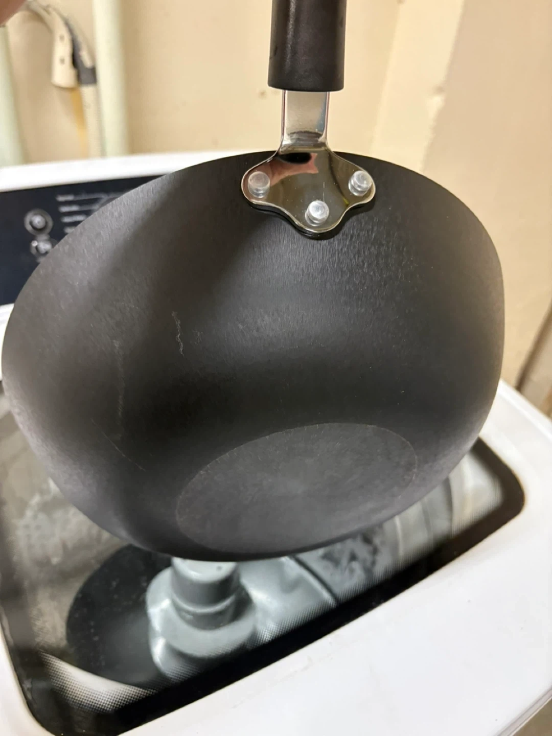 This black wok has a sturdy metal handle attached with rivets. It's made of metal and is ready for your next stir-fry! Perfect for a variety of cooking tasks.