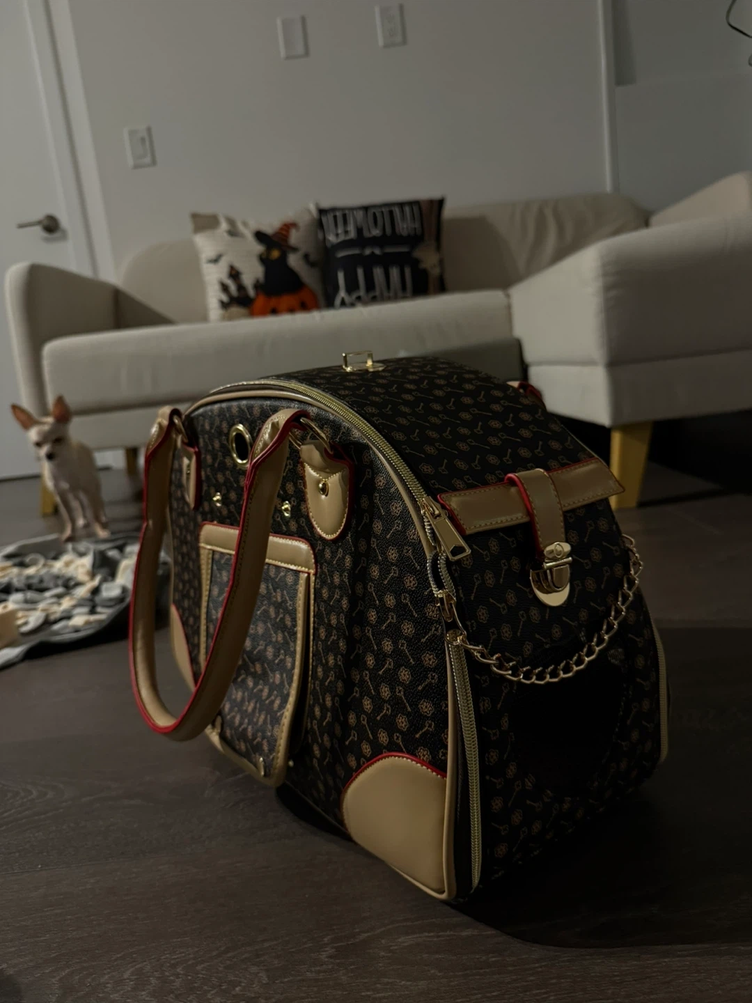 This pet carrier is perfect for travel! It's suitable for pets up to 8.8lbs/4kg. The dimensions are 42cm/16.5" (length), 31cm/12.2" (height), and 18cm/7" (width)
