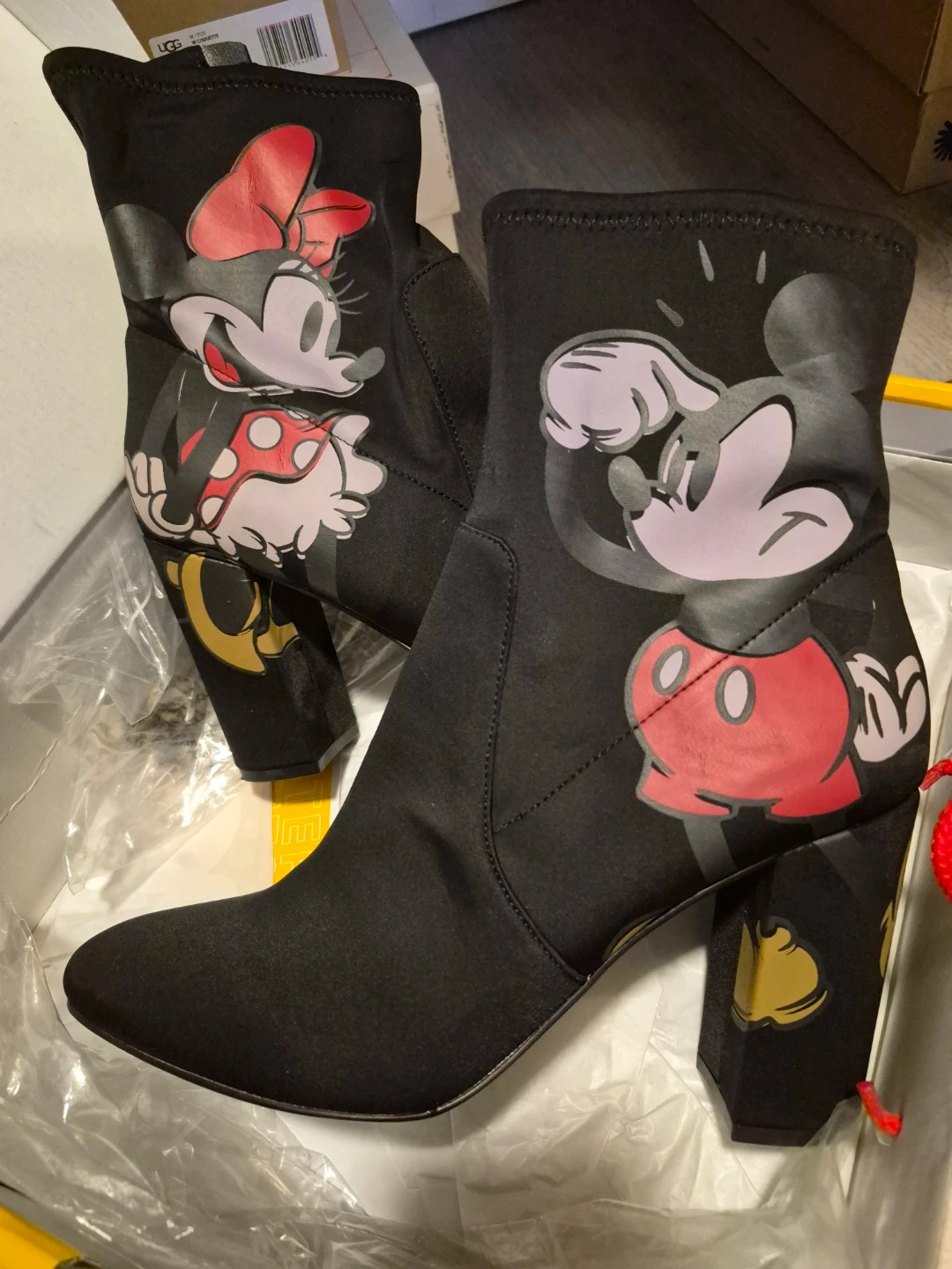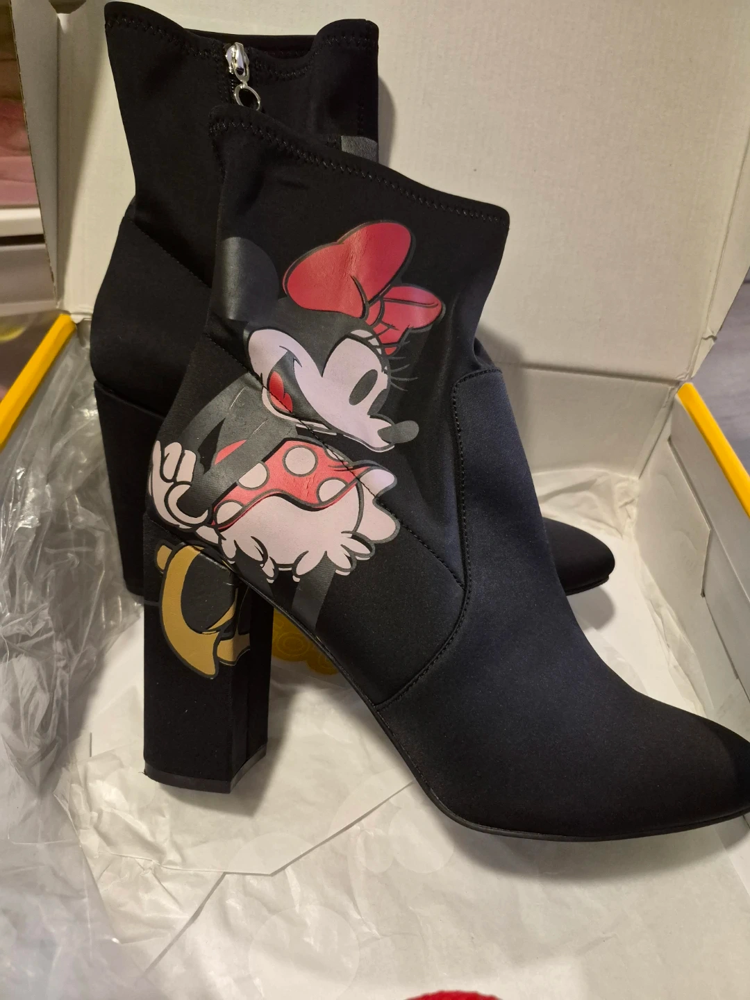 Black ankle boots featuring Mickey and Minnie Mouse graphics. Sock boot style with a block heel. Includes original box.
