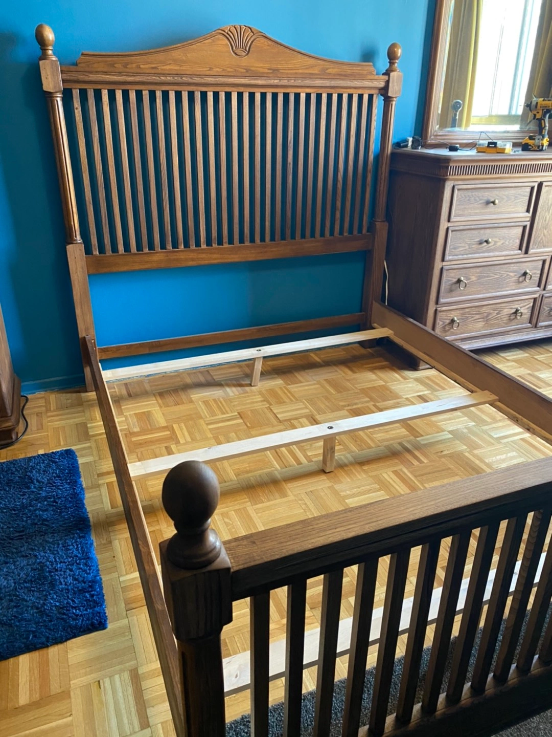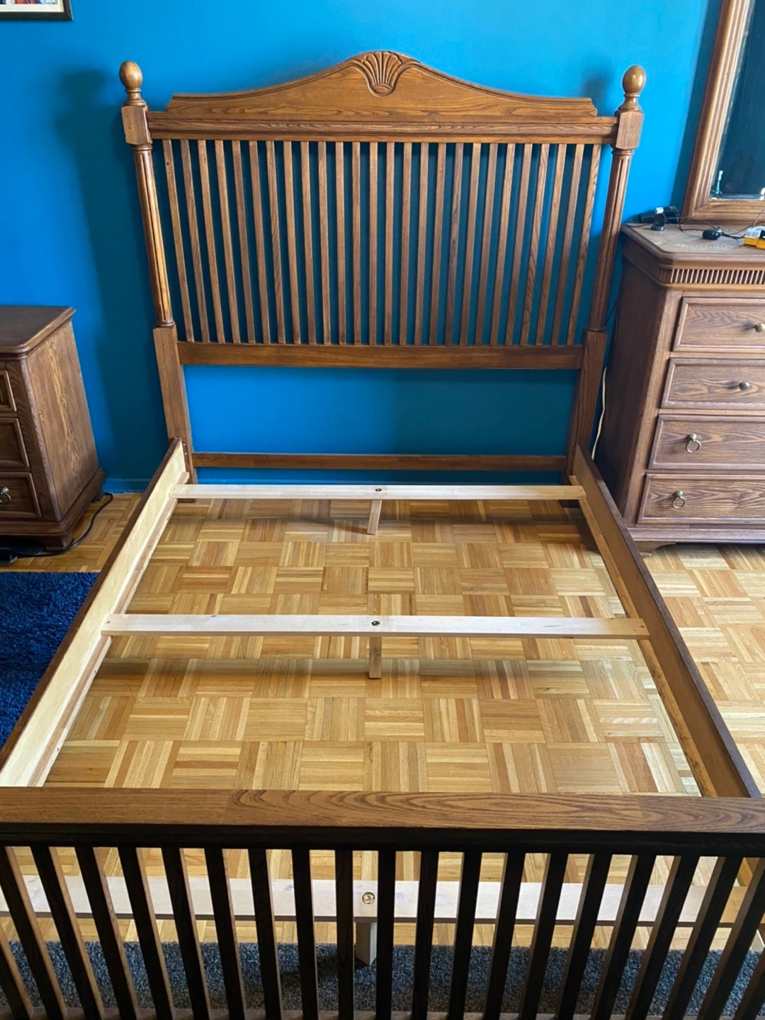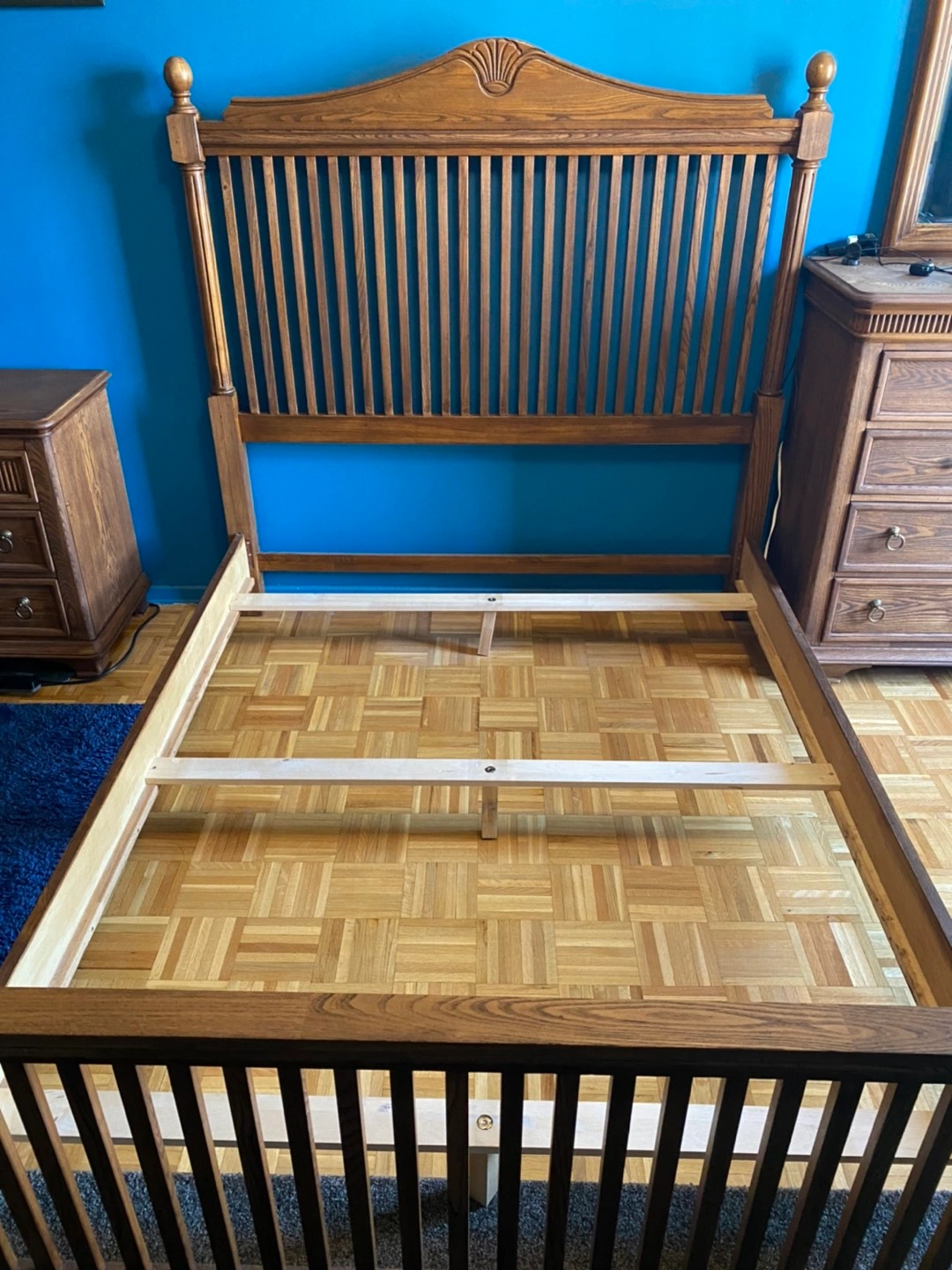 Wooden walnut queen bed frame, perfect condition.