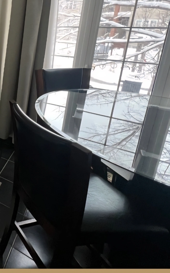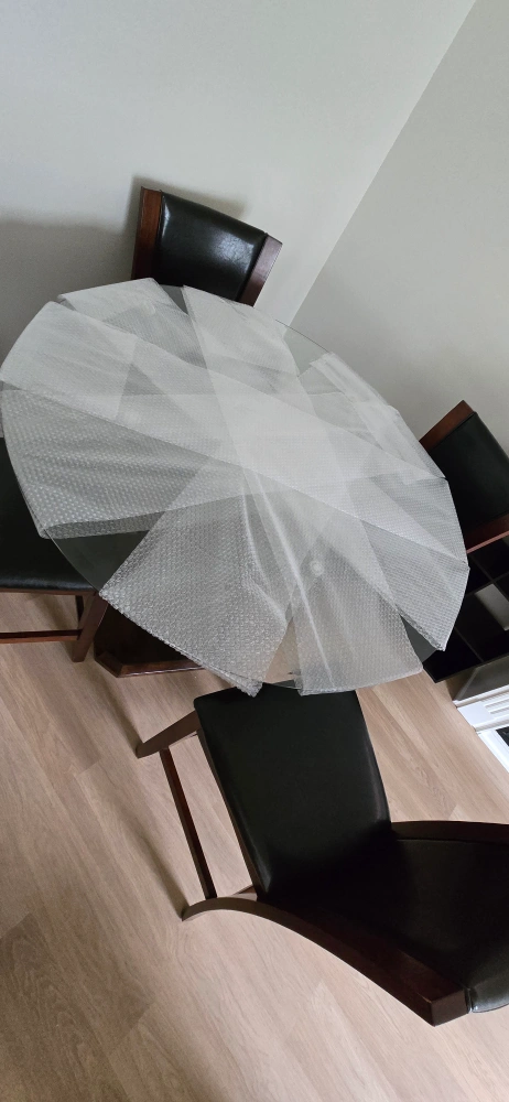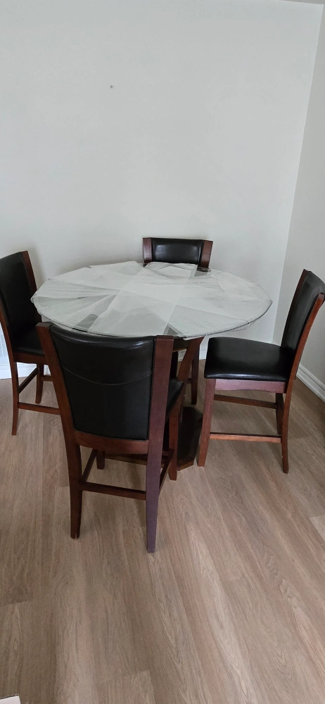 Selling a beautiful pub style dining table with four chairs. The chairs have a black leather seat and a wooden frame. The table has a glass top.