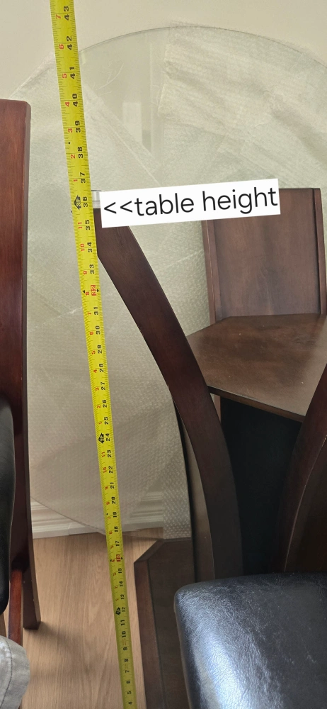 Selling a beautiful pub style dining table with four chairs. The chairs have a black leather seat and a wooden frame. The table has a glass top.