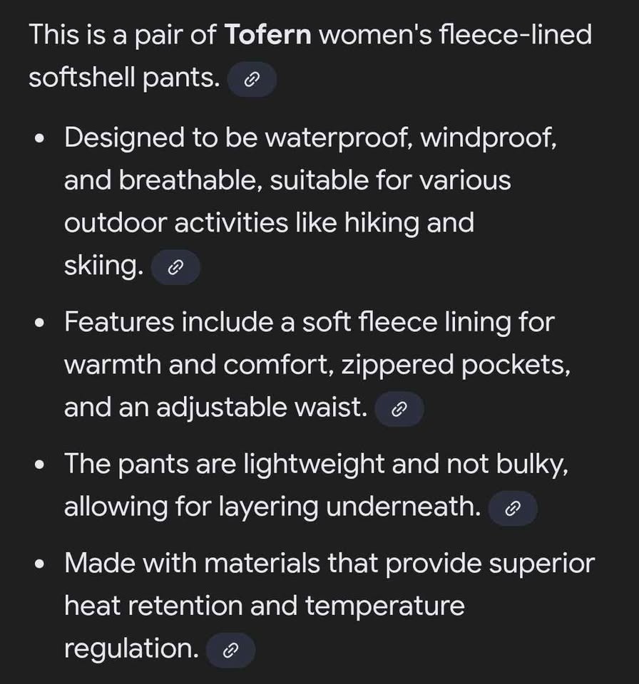 1 / 51 / 5Buy & SellTofern Women's Fleece-Lined Softshell PantsTofern Women's Fleece-Lined Softshell Pants$25Size small. In like new condition.WHERE TO MEETCheck LocationView MapSELLERKrystal Rae FullerFairmont150 reviews0 chats·0 favorites·2 viewsSEND CHAT TO SELLERHi Krystal Rae Fuller! I’m interested in your listing.Hi Krystal Rae Fuller! I’m interested in your listing.Get the Karrot app to chatSign In to chat