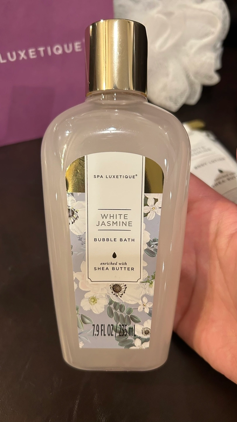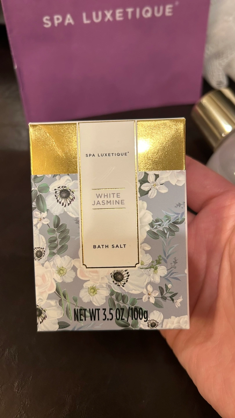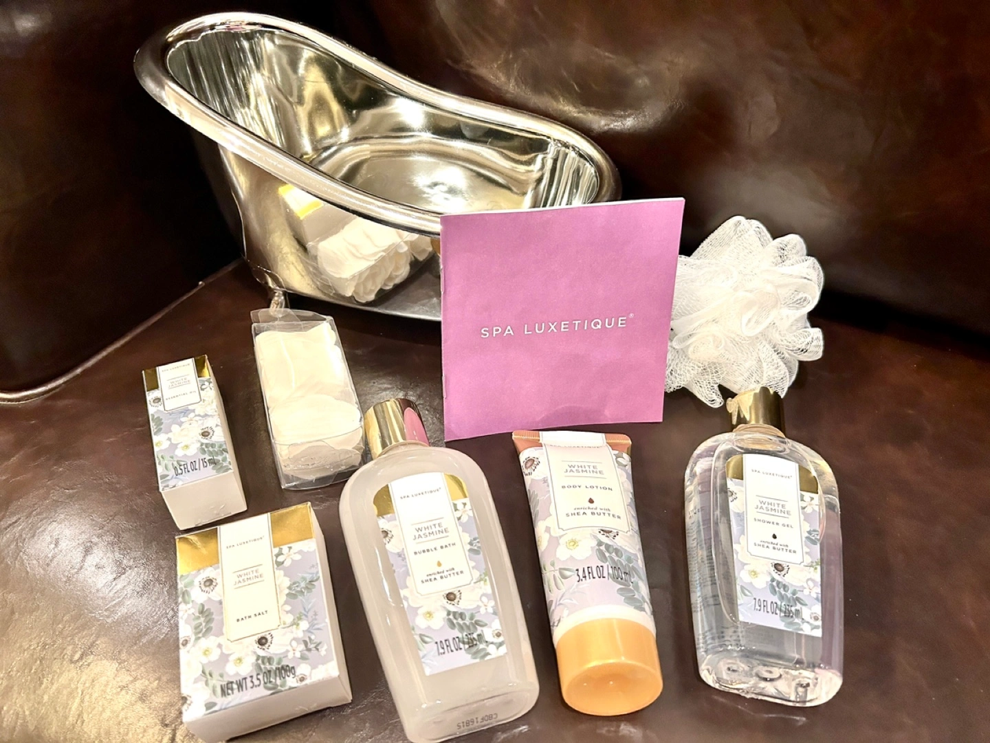 Unopened Spa Luxetique White Jasmine gift set. Includes bath salt, shower gel, body lotion, bubble bath, and two bars of soap. All products enriched with shea butter. Miniature metal foot bath included.