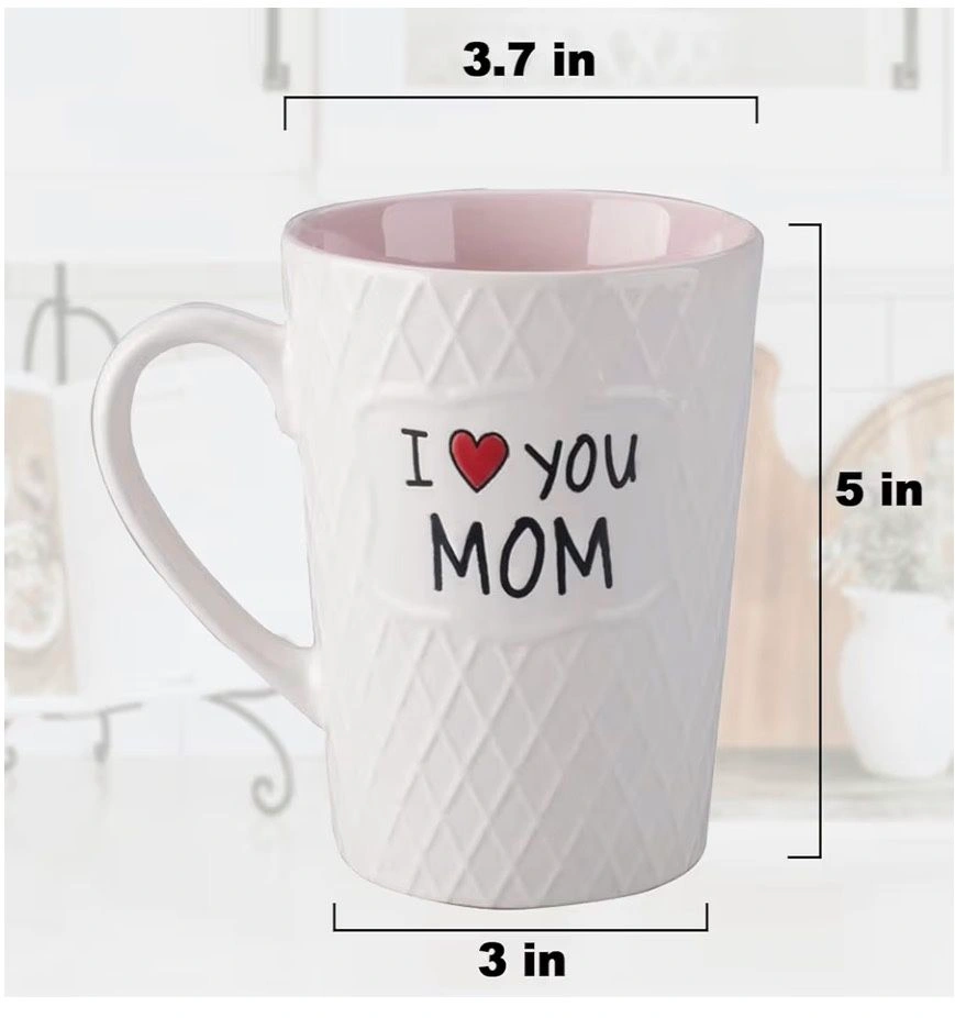 This is a lovely 16-ounce ceramic mug with an "I Love You Mom" design, perfect for Mother's Day or any occasion to show appreciation. It features a unique double-sided design with a geometric relief on the outside and a pink glaze on the inside for a comfortable, non-slip grip.